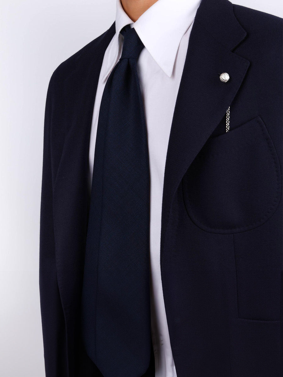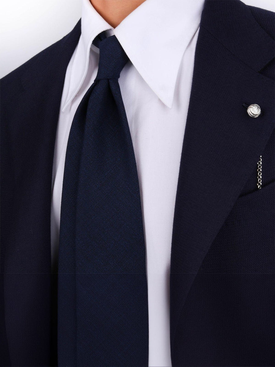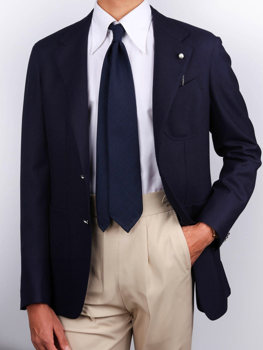 Cravatta in lana blu navy, texture discreta, taglio tre pieghe, senza fodera, cucitura a mano, orlata a mano, stile business chic, accessorio maschile, modello Josua