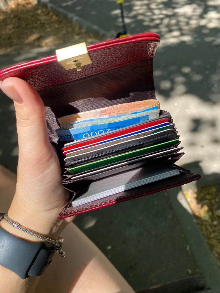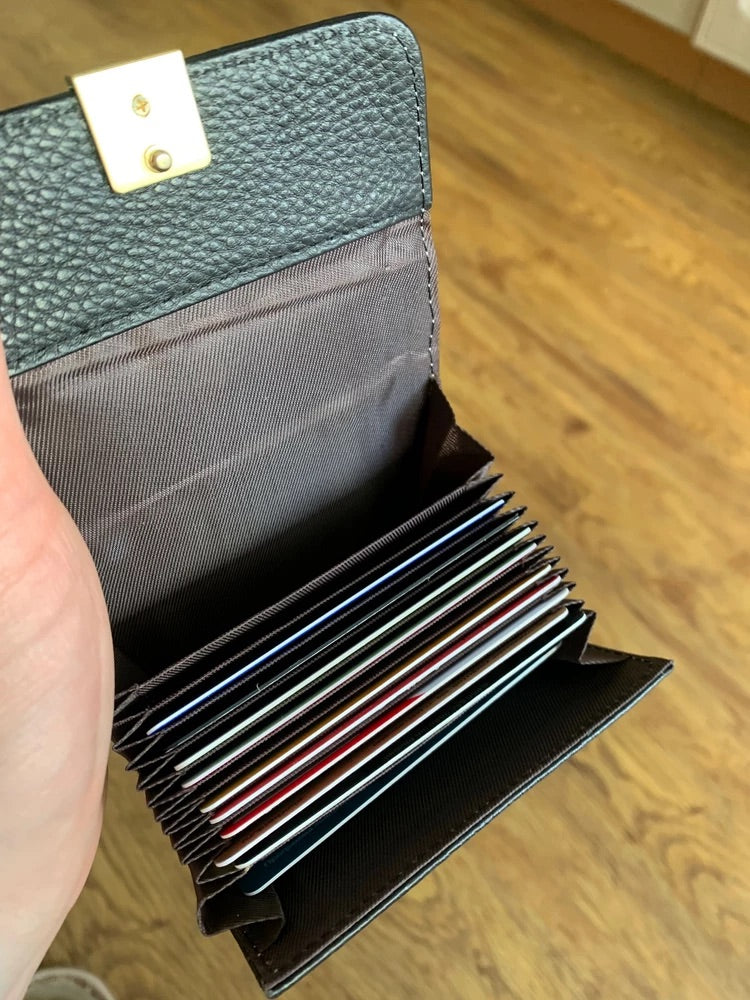 Il suo design a fisarmonica consente di riporre facilmente fino a 12 carte senza sovrapporle. Due scomparti aggiuntivi accolgono banconote piegate. Questo modello non dispone di tasca portamonete per mantenere un formato ultra sottile.