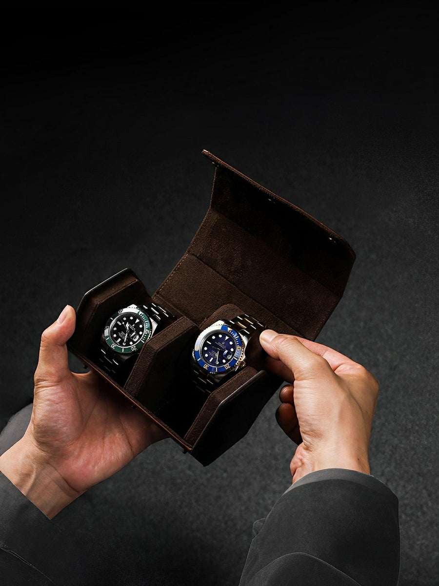 L’interno è foderato in velluto morbido che protegge i vostri orologi da graffi e urti. I due scomparti imbottiti mantengono ogni orologio saldamente in posizione, offrendo una protezione ottimale. Il suo sistema di chiusura a bottoni a pressione garantisce un’apertura e una chiusura facili, assicurando al contempo la massima sicurezza.