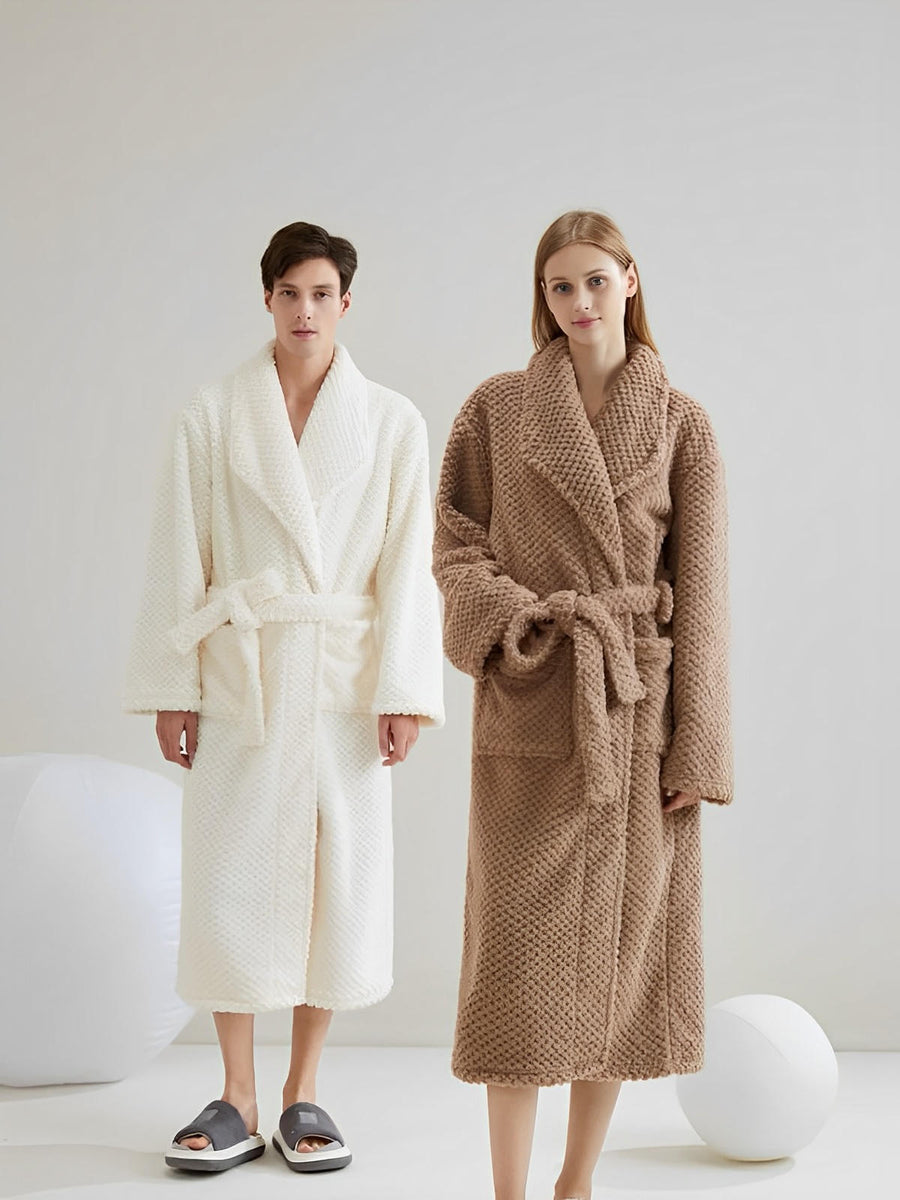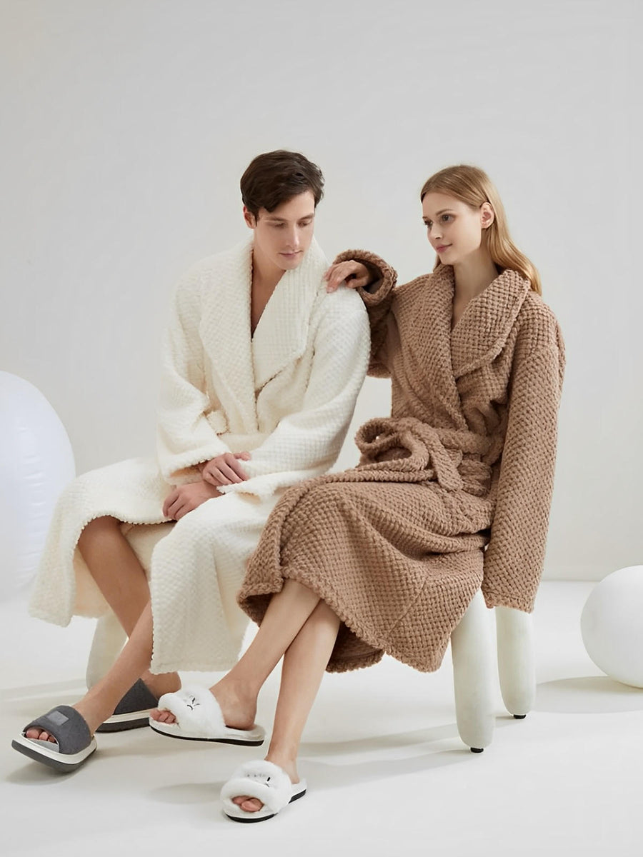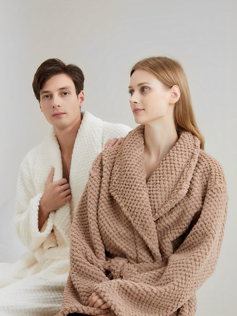 Peignoir uomo donna, cotone morbido testurizzato, collo sciallato, cintura rimovibile, due tasche pratiche, comfort per la casa, lunghezza metà polpaccio, modello Junia