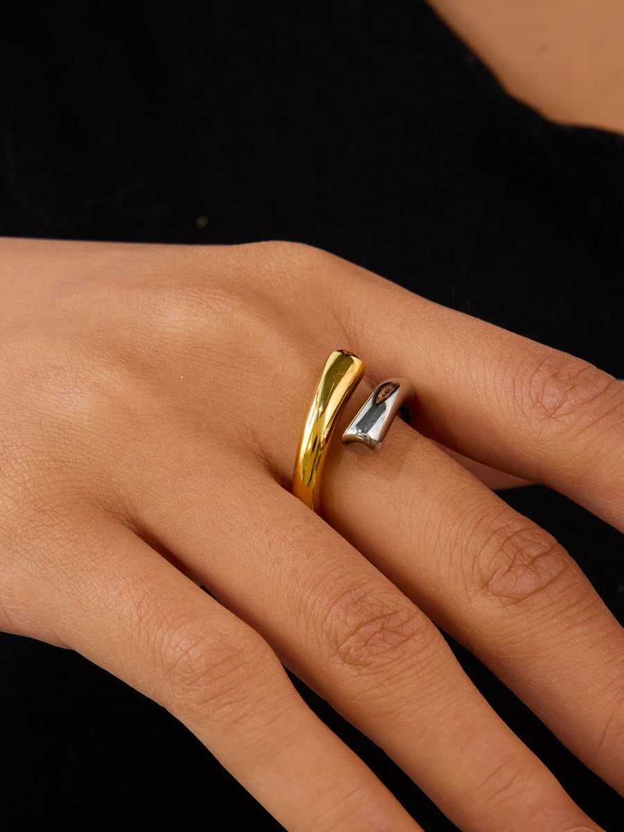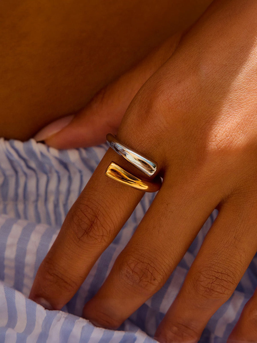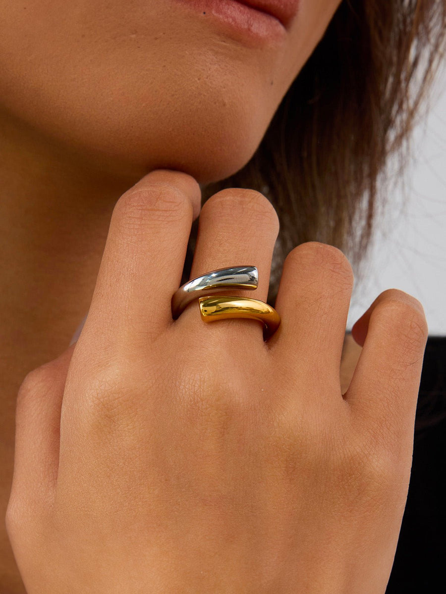 Con il suo design incrociato audace che unisce finiture dorate e argentate, questo anello aperto incarna un tocco moderno e grafico da indossare ogni giorno. Realizzato in acciaio inossidabile, resiste perfettamente all’acqua e non provoca alcuna reazione cutanea, risultando adatto anche alle pelli più sensibili.