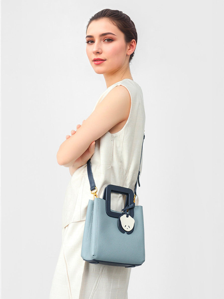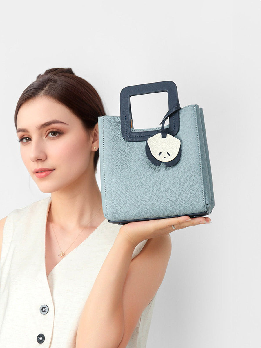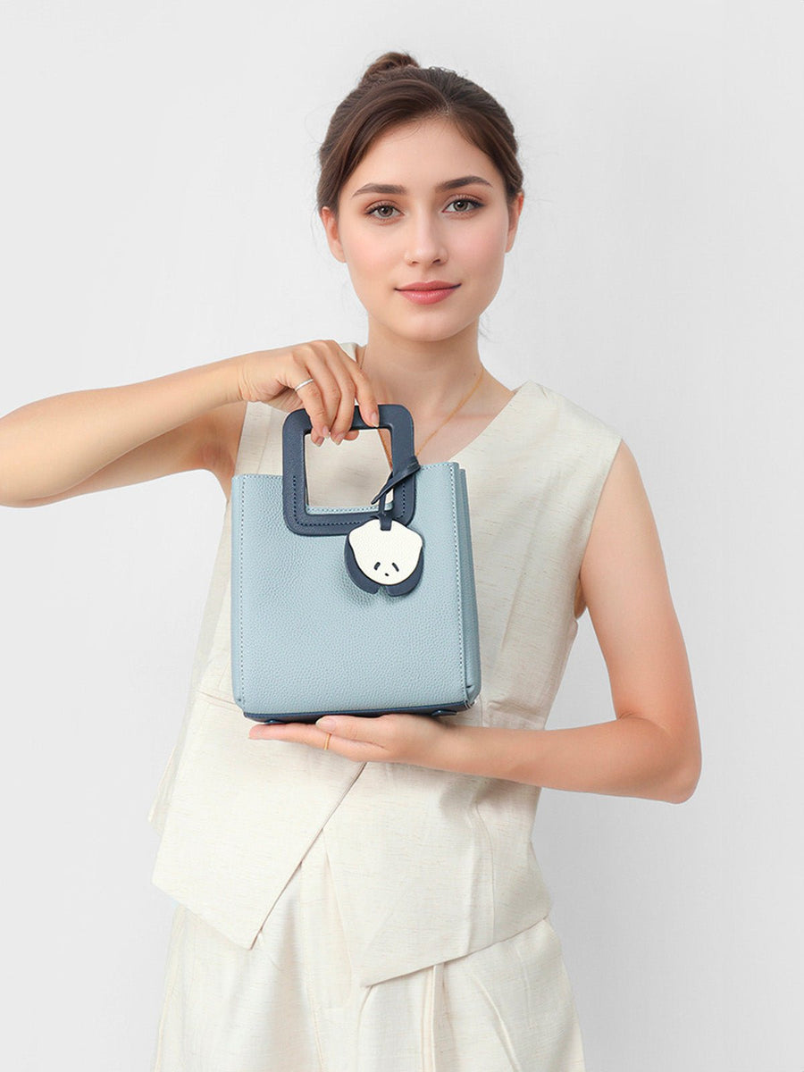 Borsa a mano blu in pelle, manico quadrato, tracolla regolabile, formato trapezoidale, charm panda, modello Katrina