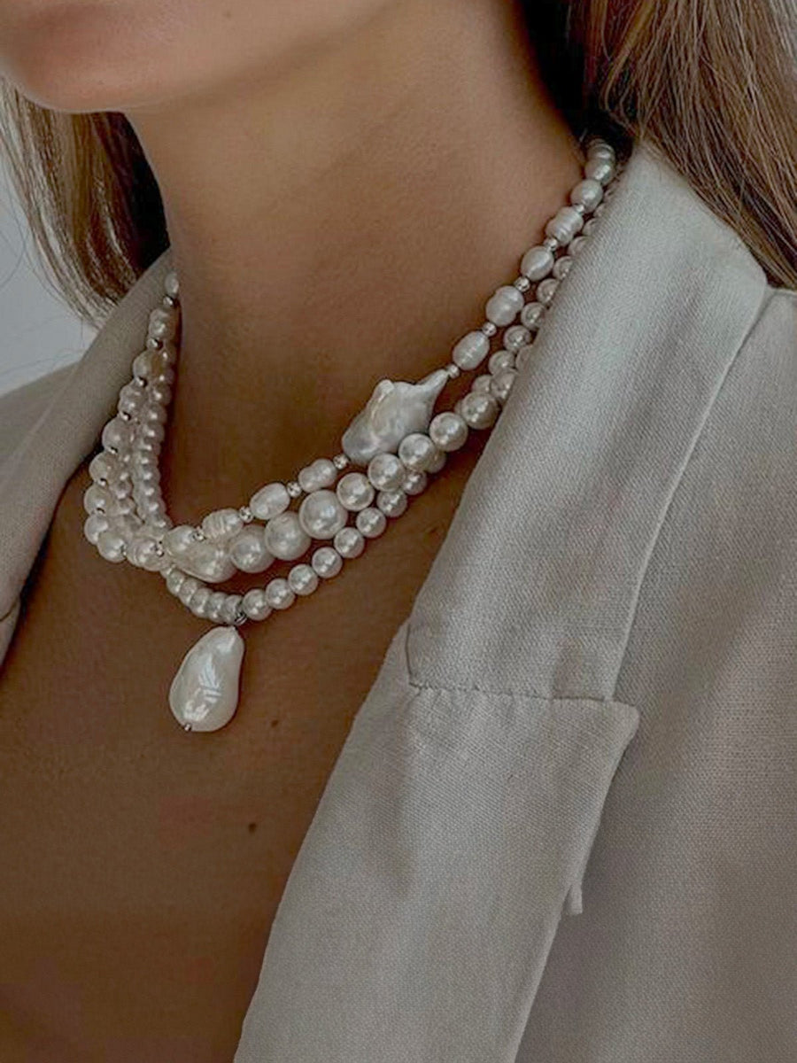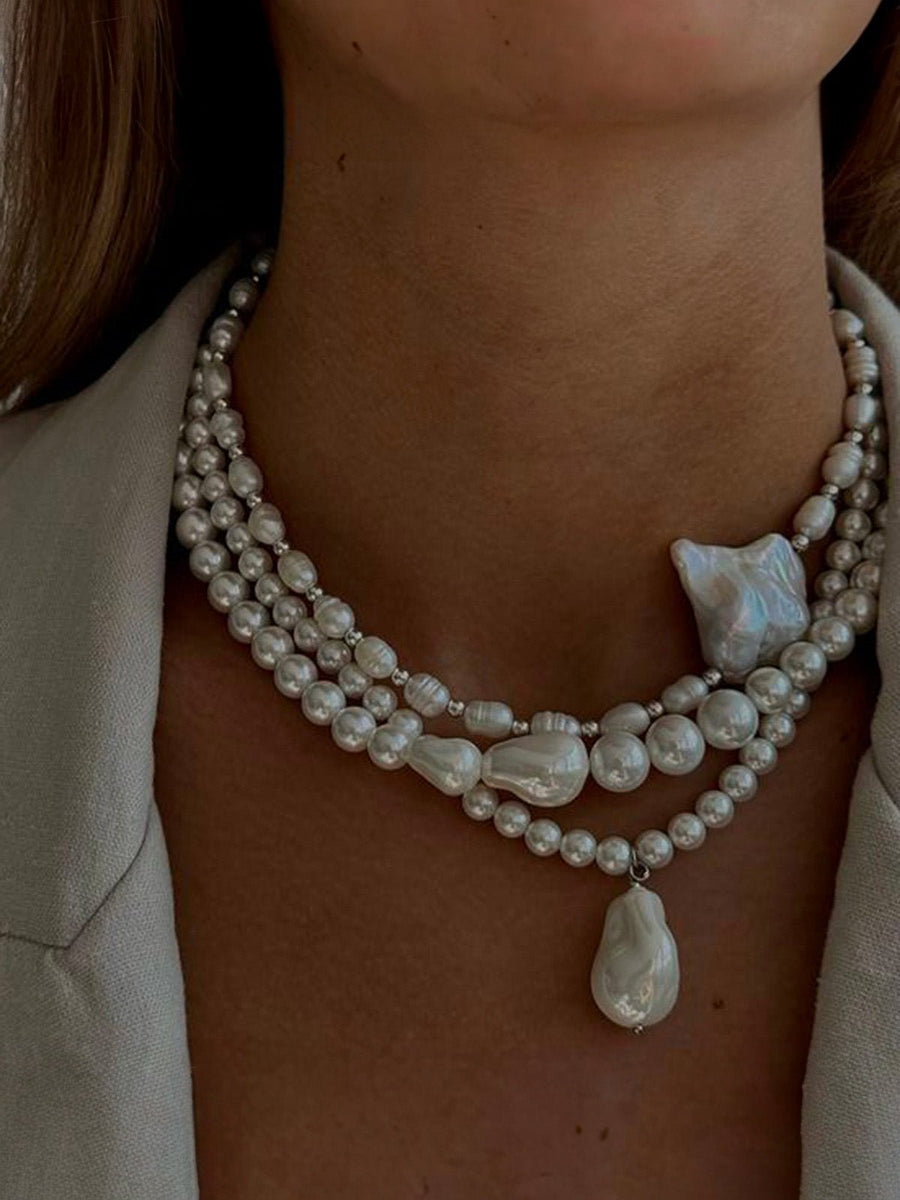 Affermate il vostro stile con questa collana di perle madreperlate con pendente barocco, pezzo centrale di una silhouette audace. Le perle perfettamente sferiche si allineano intorno al collo per creare una collana al tempo stesso raffinata ed espressiva. Al centro, una perla barocca dall’aspetto organico cattura ogni sguardo e sottolinea l’unicità di questa creazione.