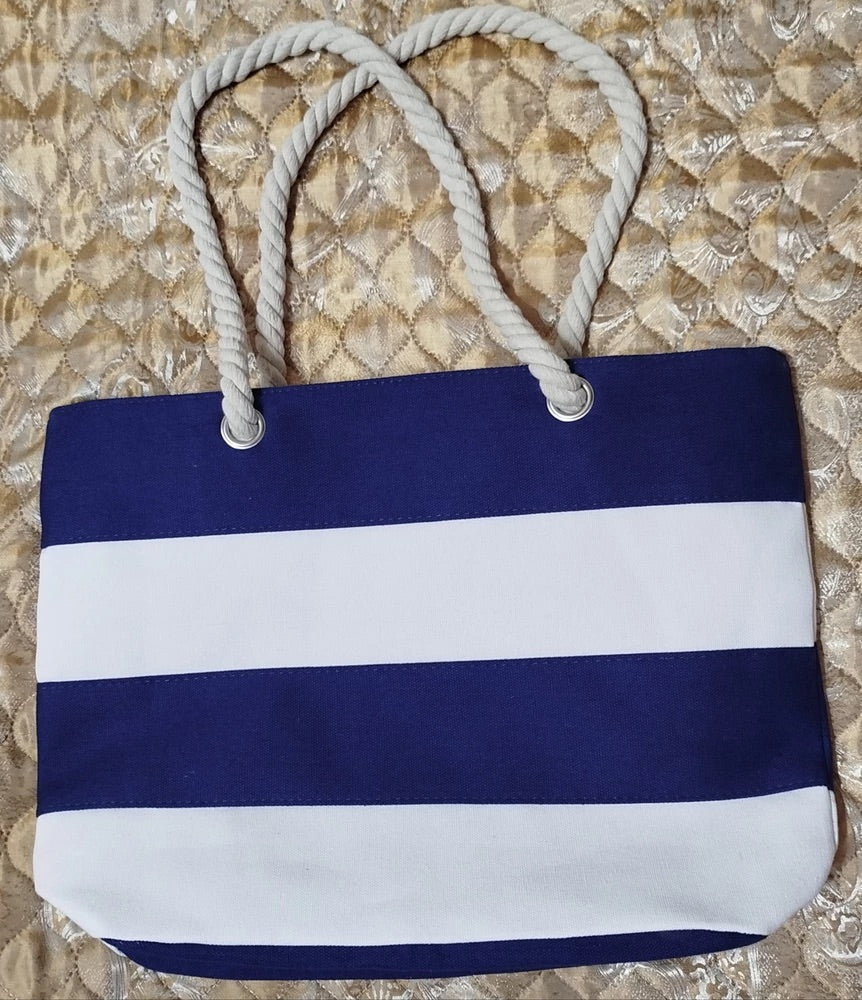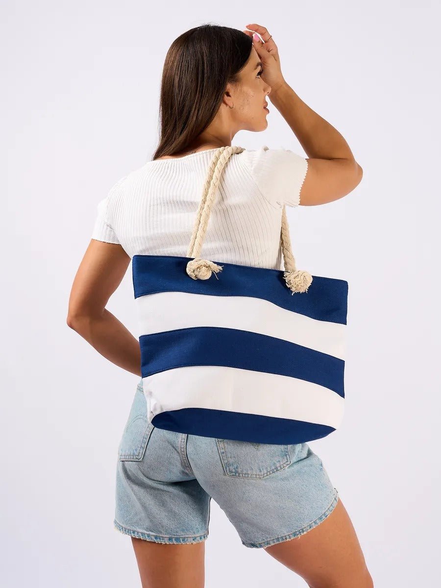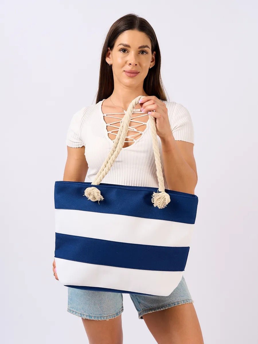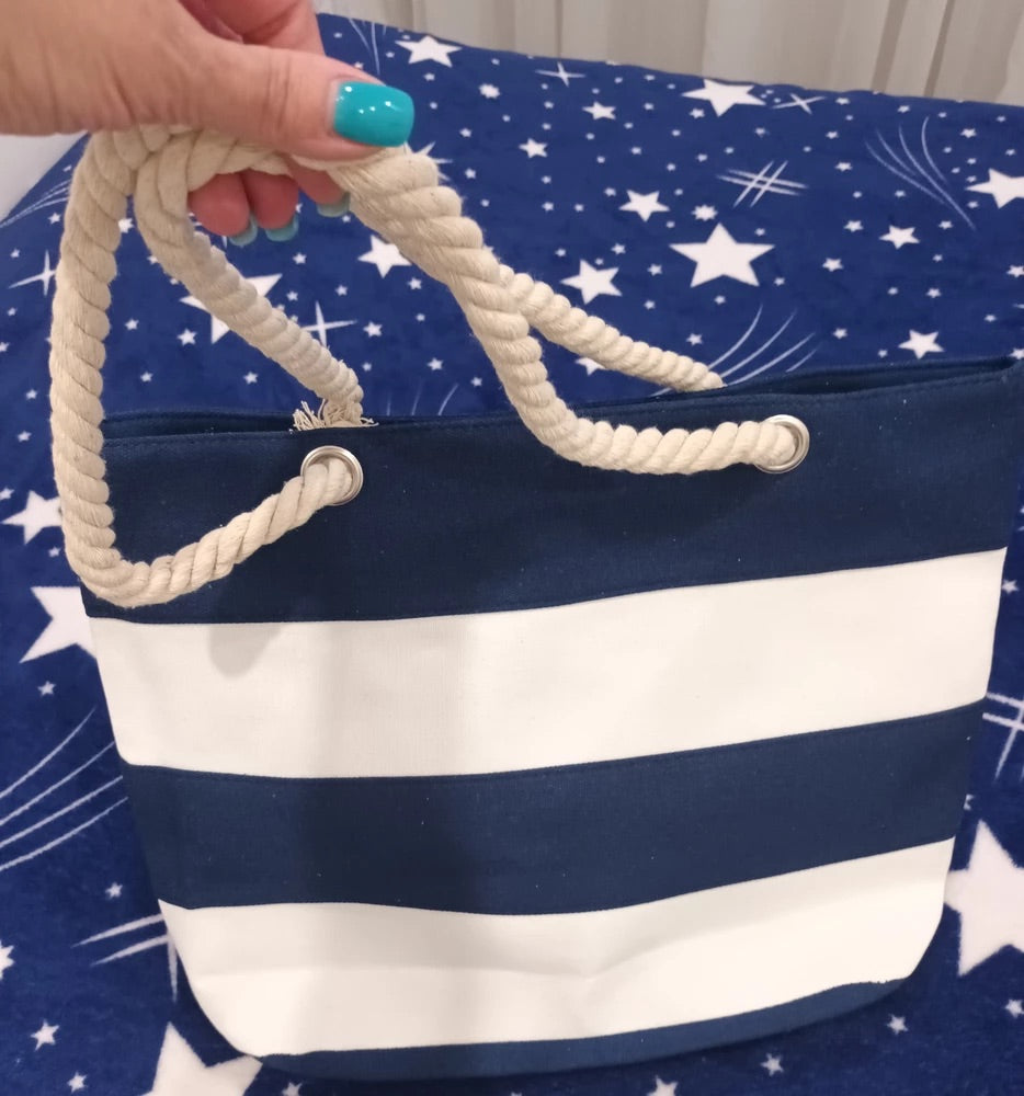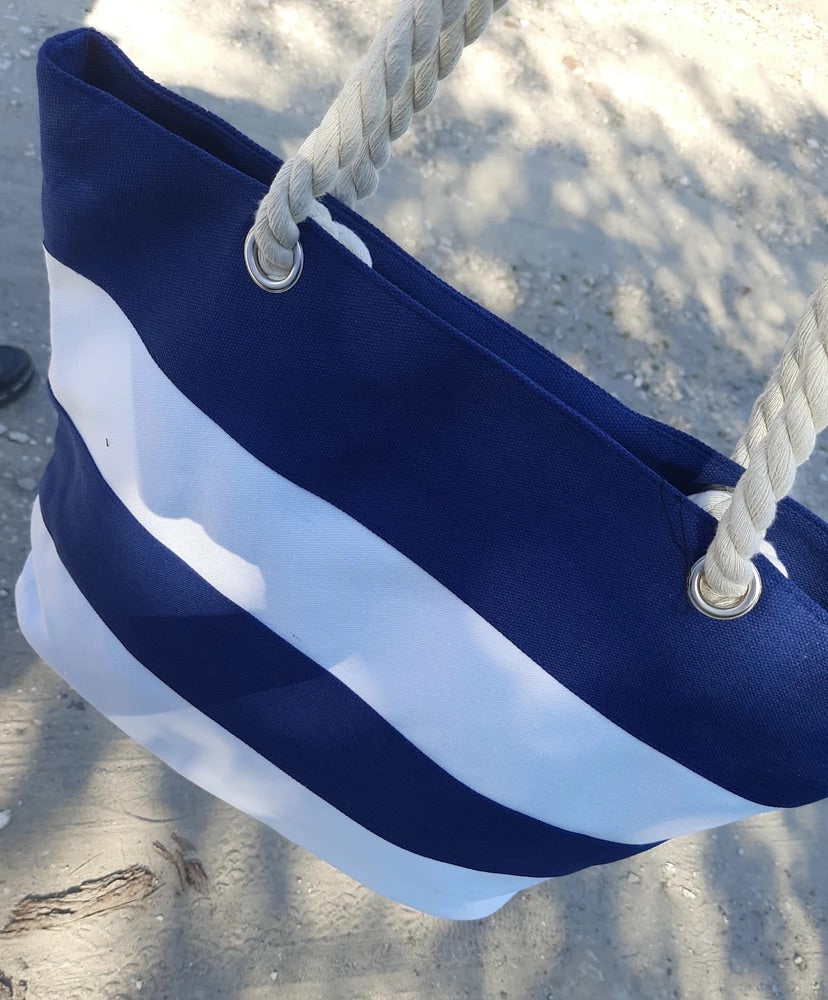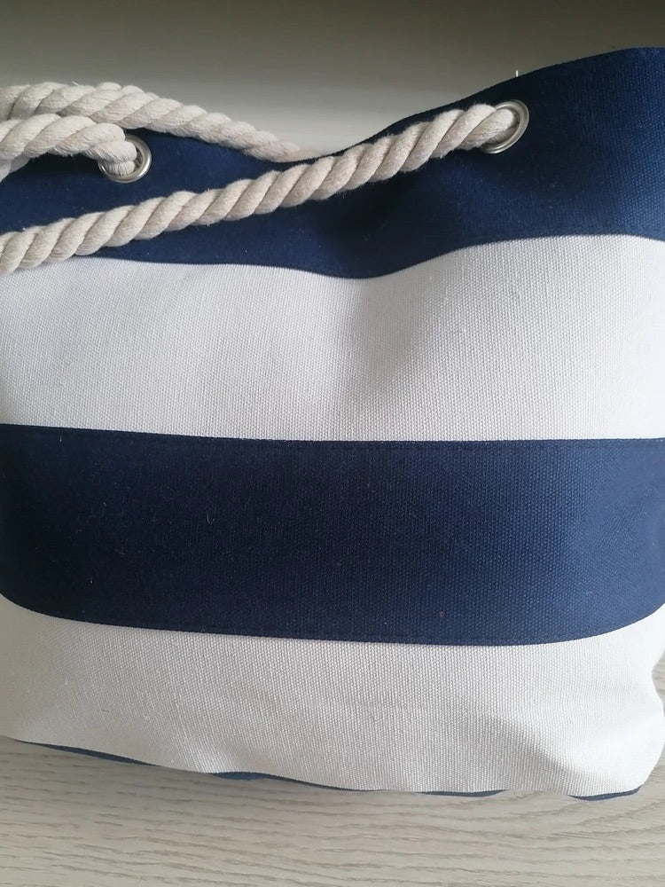 Questa borsa shopper a righe conquista con il suo look marinaro deciso e la sua grande capienza. Realizzata in tela spessa composta da cotone e poliestere, offre una buona tenuta senza risultare rigida, ideale per un uso quotidiano estivo.