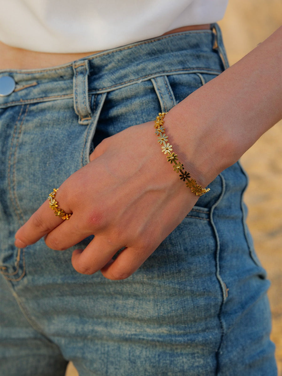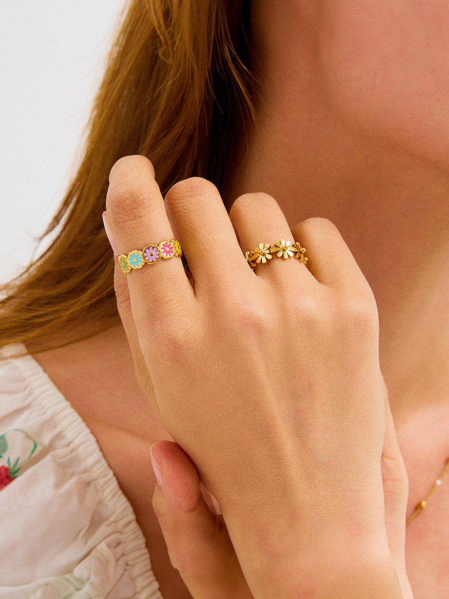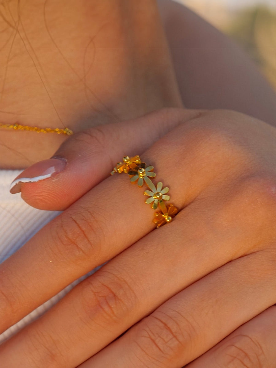 Lasciatevi conquistare da questo anello floreale dorato, un gioiello luminoso che valorizza istantaneamente le mani. La sua realizzazione in acciaio inossidabile garantisce una tenuta perfetta nel tempo, anche con un uso quotidiano.