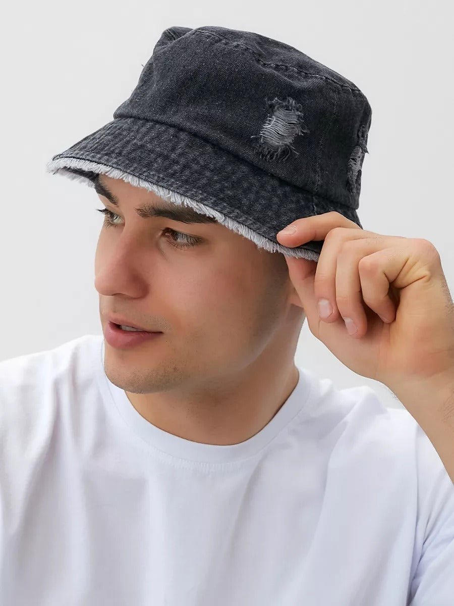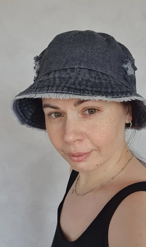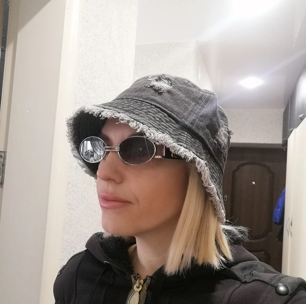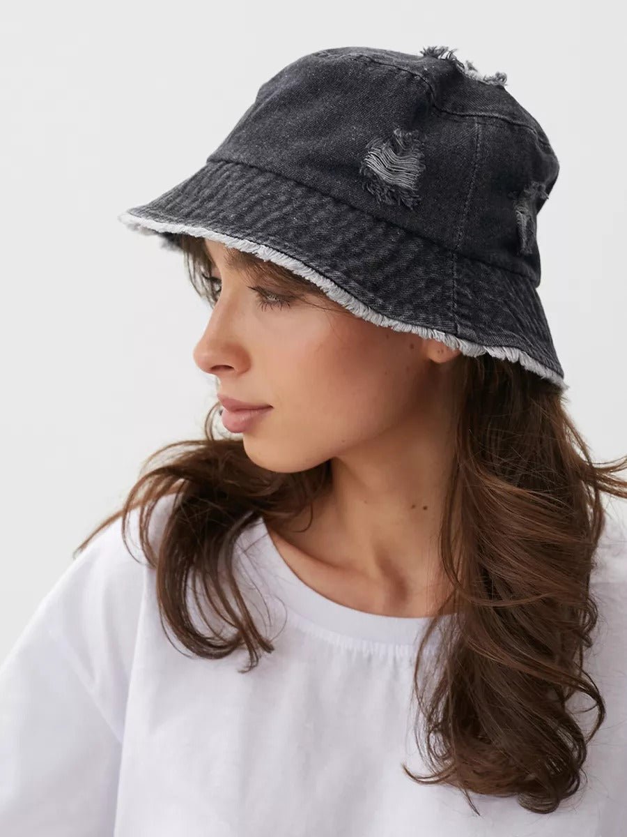 Bob in denim usato, effetto vintage, bordi sfrangiati, stile unisex, tendenza Y2K, modello Kelips