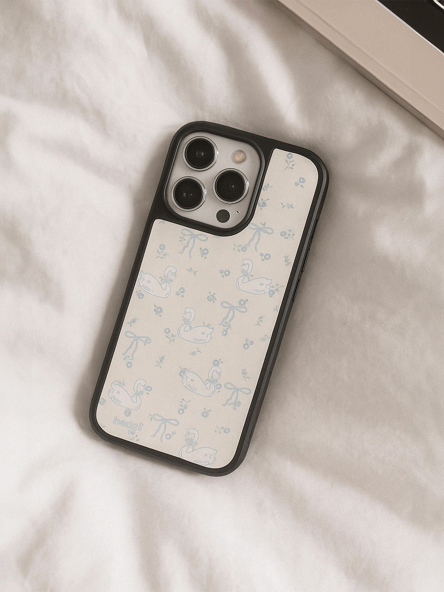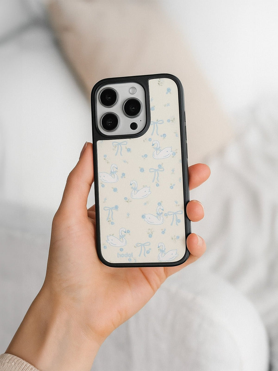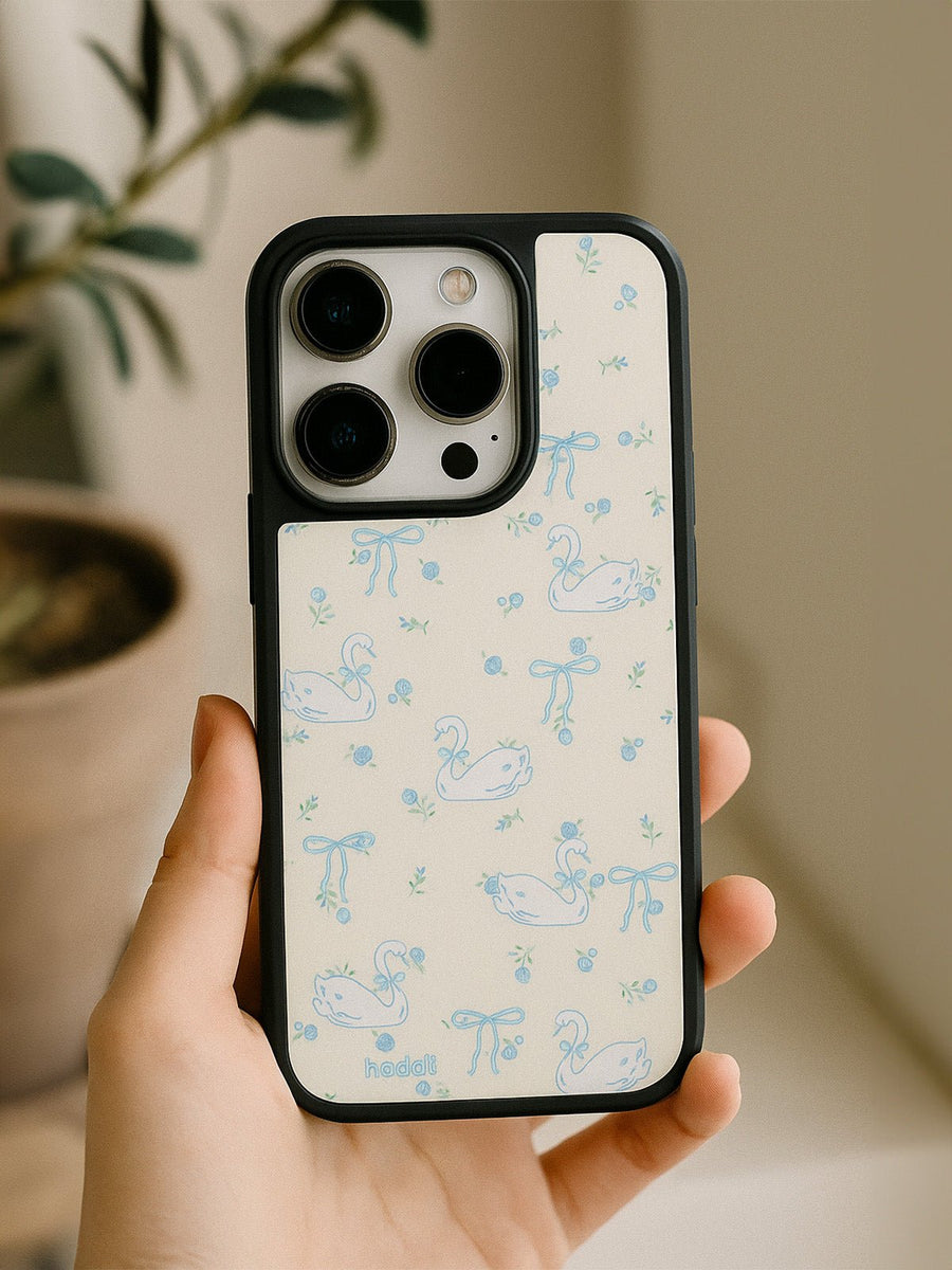 Scoprite questa cover per iPhone dal design delicato decorata con eleganti cigni e fiocchi blu, pensata per proteggere il vostro dispositivo con raffinatezza. La sua superficie opaca riduce al minimo le impronte e i riflessi, valorizzando al contempo il suo motivo originale.