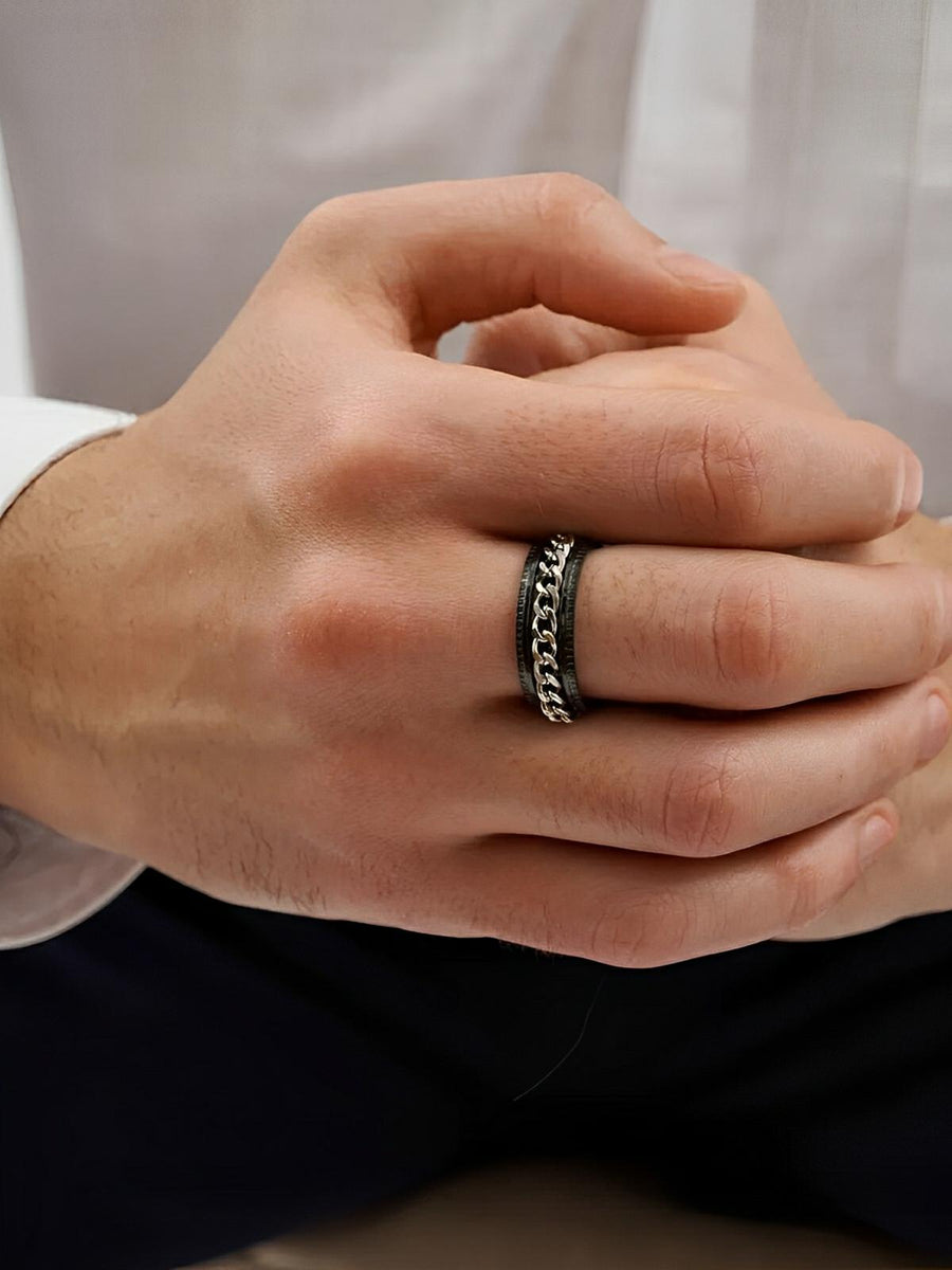 Immergetevi in un universo di carattere con questo anello antistress realizzato in acciaio inossidabile di alta qualità. Il suo design unico è valorizzato da una catena centrale rotante che offre un'esperienza tattile piacevole, ideale per alleviare le tensioni quotidiane.
