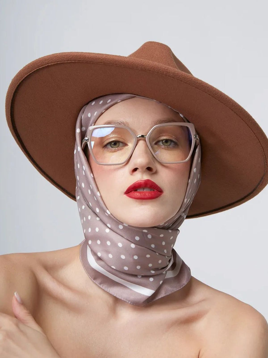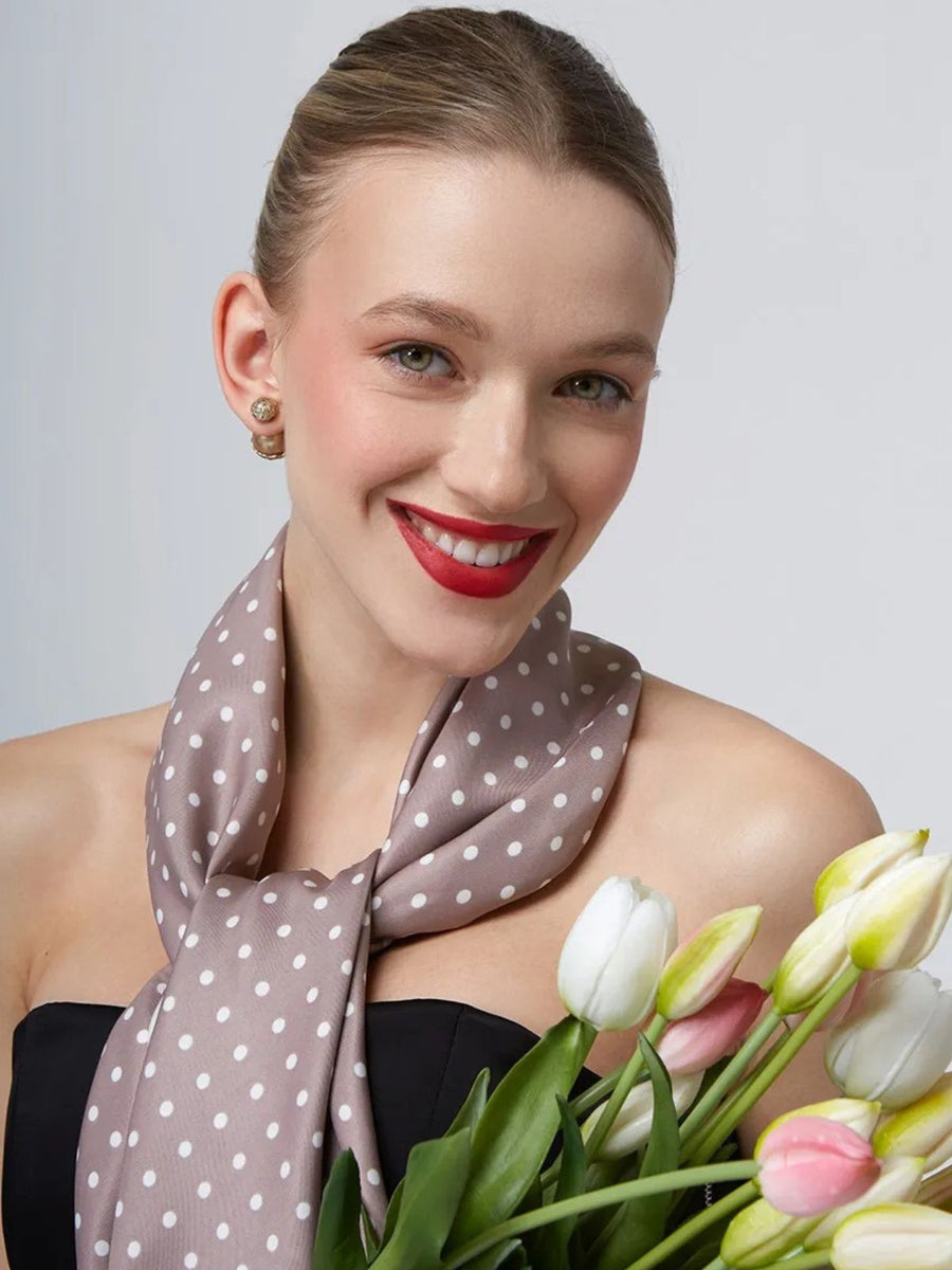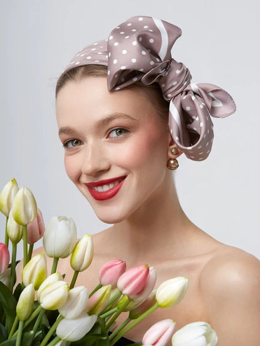 Il suo motivo a pois bianchi su fondo beige cipria si abbina facilmente a qualsiasi stile, dal più classico al più moderno. Potete indossarlo intorno al collo, come accessorio per capelli o anche come stola leggera sulle spalle.