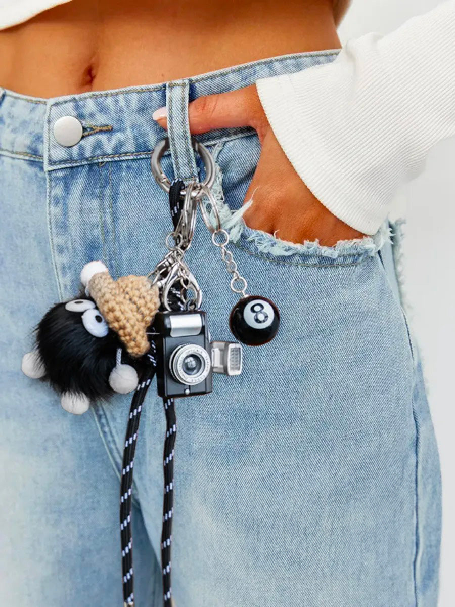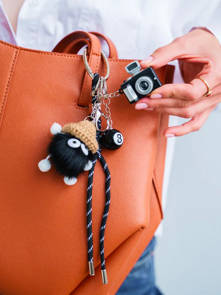 Aggiungete un tocco di personalità e di fantasia alla vostra borsa, zaino o portachiavi grazie a questo portachiavi multi-accessori. Questo gioiello da borsa è composto da un'espressiva peluche nera con un cappello all'uncinetto beige, un mini apparecchio fotografico retrò in plastica rigida, una palla 8 nera e una corda intrecciata nera con dettagli bianchi.