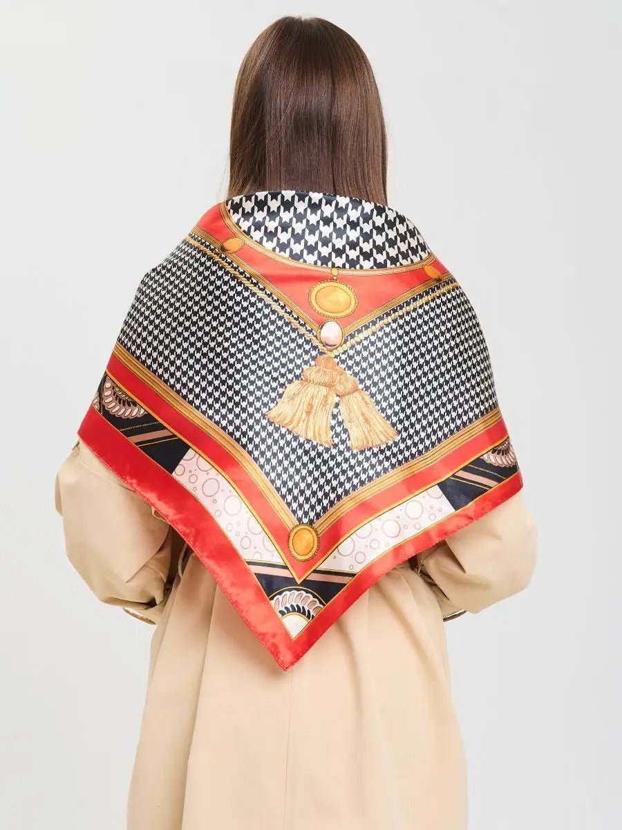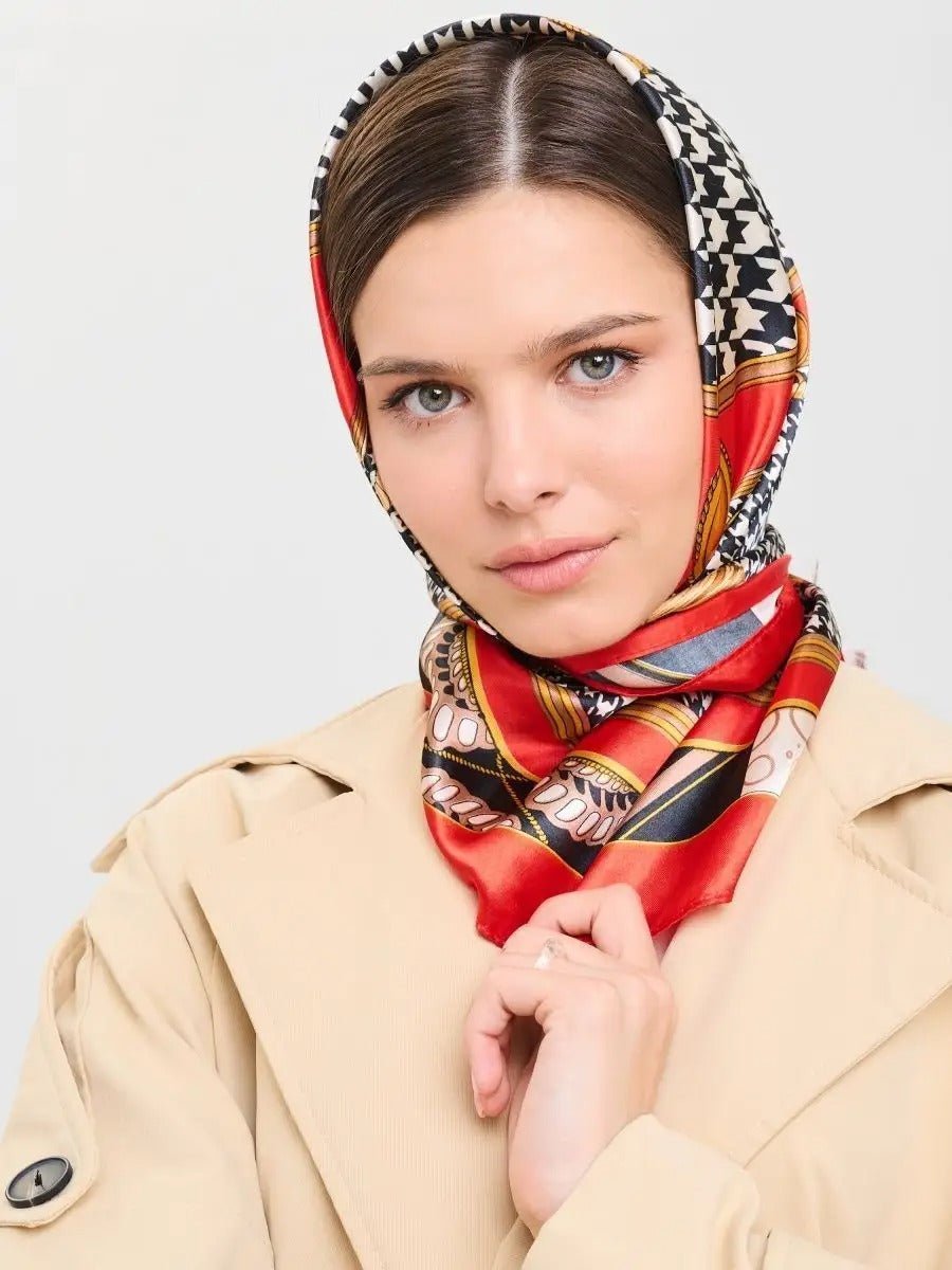 Foulard carré effet satinato, foulard stampato rosso nero bianco, sciarpa foulard donna 90x90, accessorio moda chic, foulard a motivo geometrico, modello Laurel