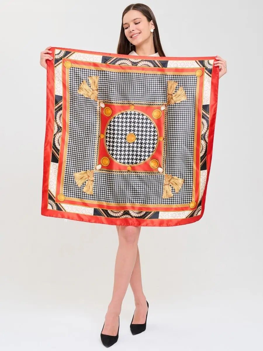 Questo foulard quadrato satinato 90x90 cm è un accessorio audace e raffinato che trasforma un outfit in un attimo. Realizzato in poliestere effetto seta, offre un tocco morbido e fluido che segue naturalmente i movimenti. La stampa unisce con carattere motivi geometrici neri e bianchi, arricchiti da dettagli dorati su uno sfondo rosso brillante.