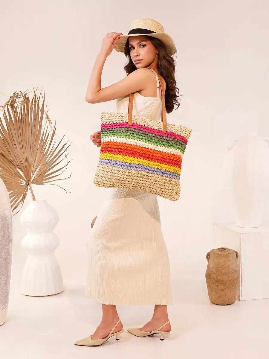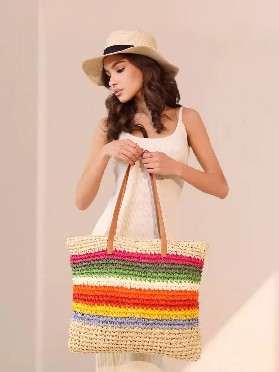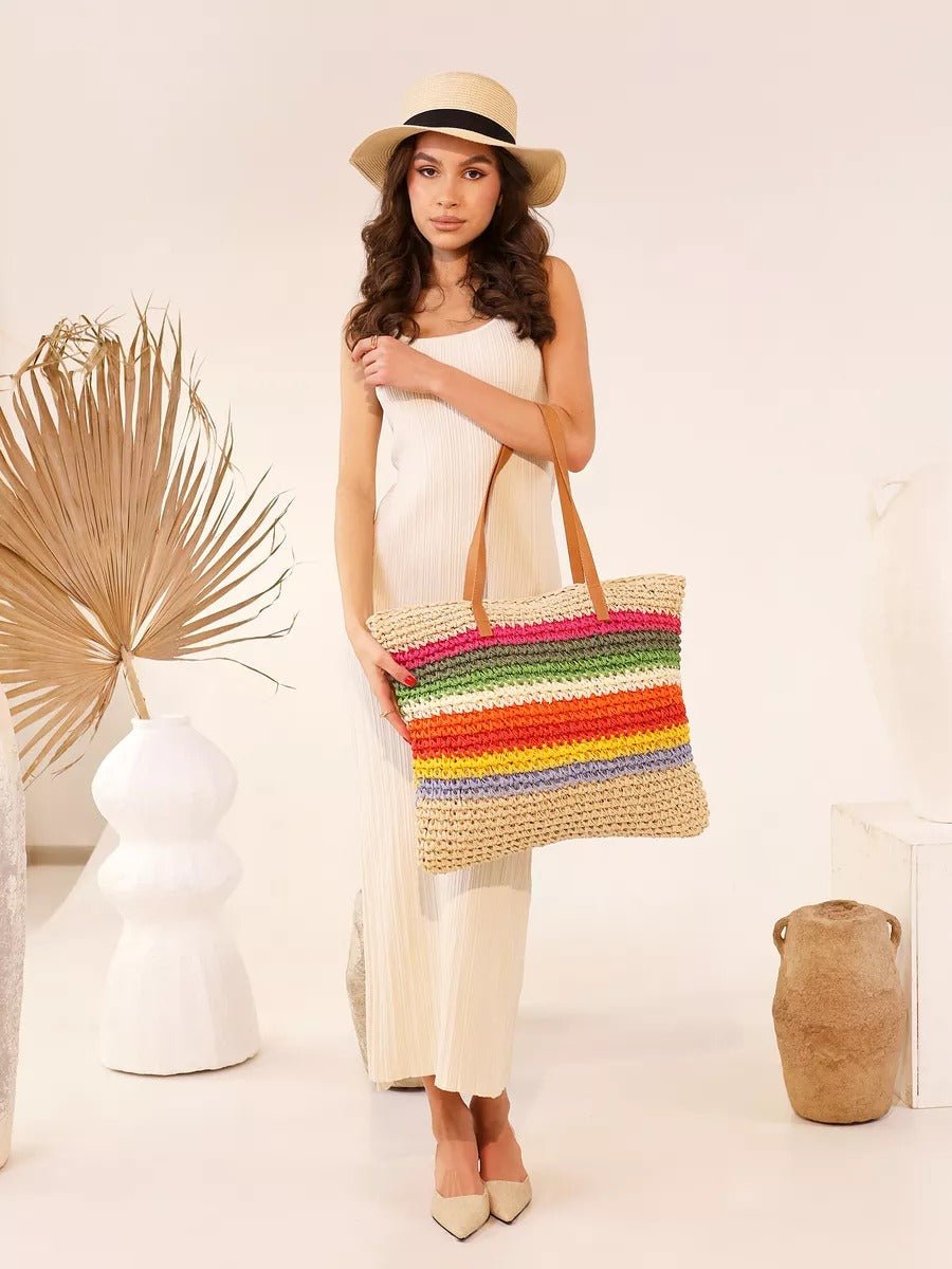 Borsa da spiaggia shopper in rafia, multicolore, a righe, manici lunghi, stile tote bag, formato grande, modello Leila