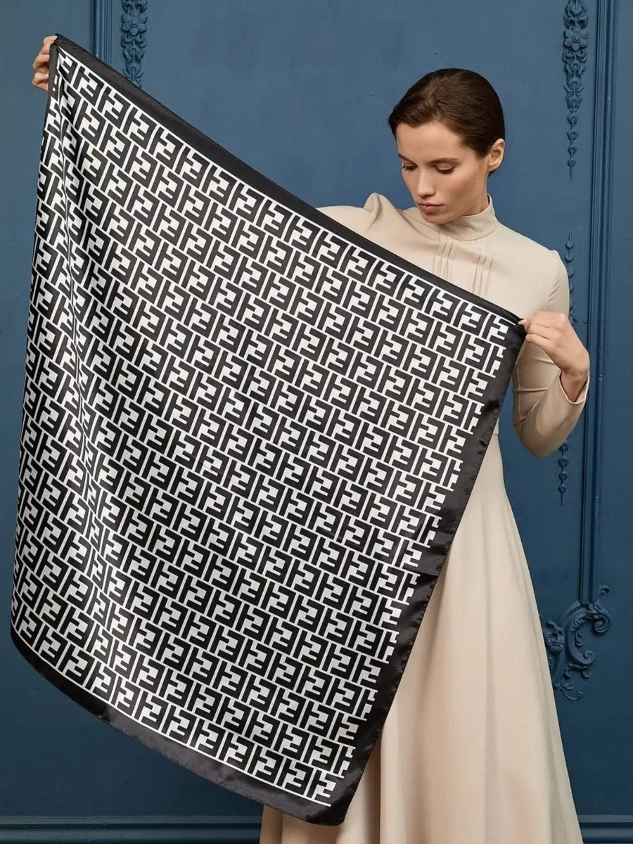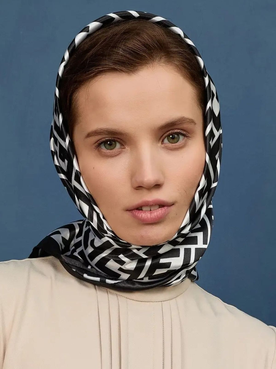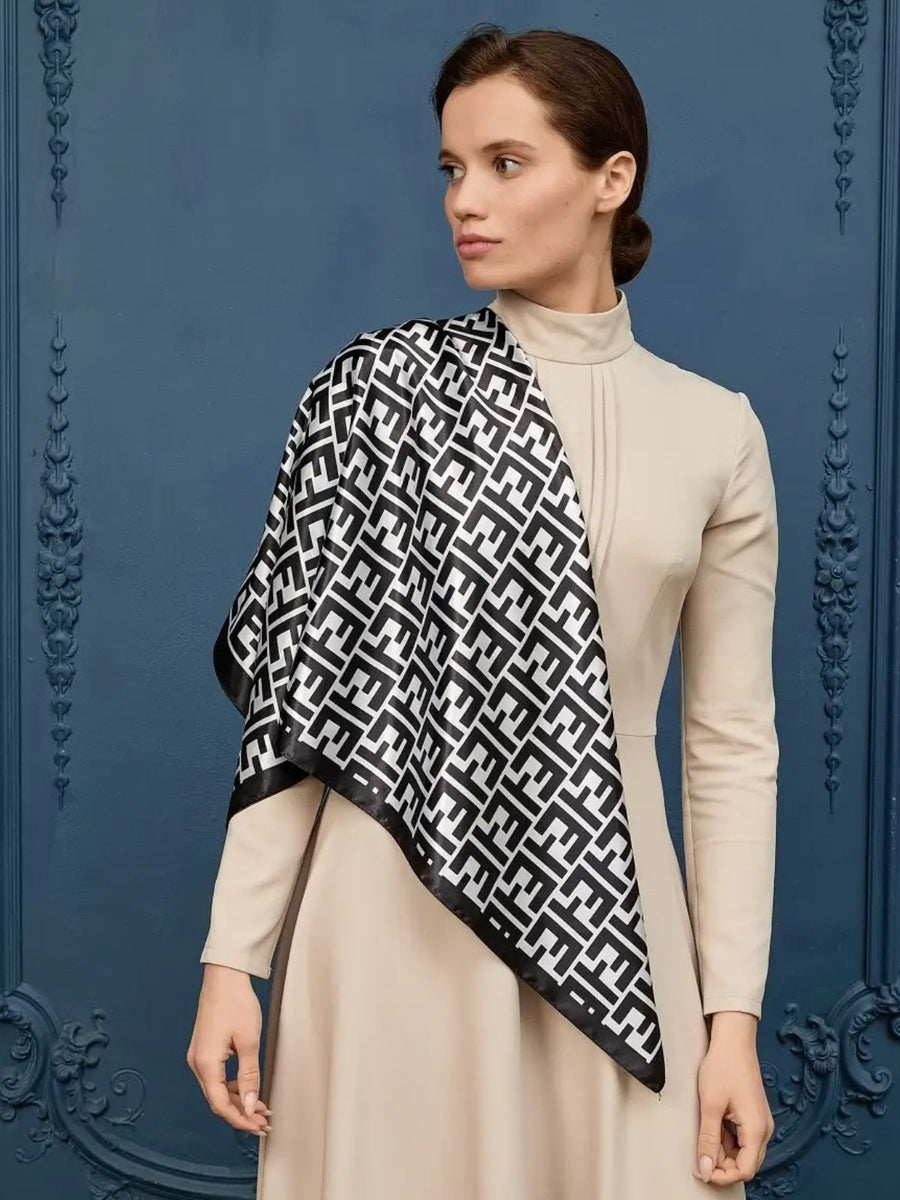Il suo motivo geometrico strutturato nero su fondo bianco aggiunge un tocco grafico contemporaneo, rendendo questo foulard perfetto sia per i look quotidiani che per gli abbinamenti più eleganti. Si trasforma facilmente in fascia per capelli, accessorio per borsa o turbante stilizzato.