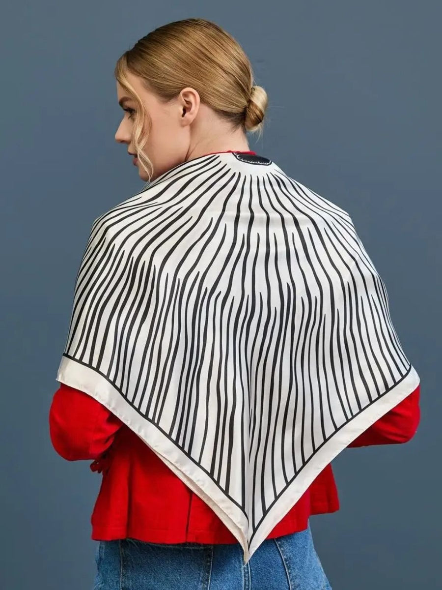 Questo foulard quadrato nero e bianco incarna la perfetta fusione tra semplicità visiva e ricchezza di utilizzi. Realizzato in fibra effetto satinato in poliestere, offre una sensazione ultra morbida e liscia al tatto, simile alla vera seta. Con il suo motivo a righe grafiche concentriche su fondo avorio, aggiunge una nota contemporanea a qualsiasi outfit.