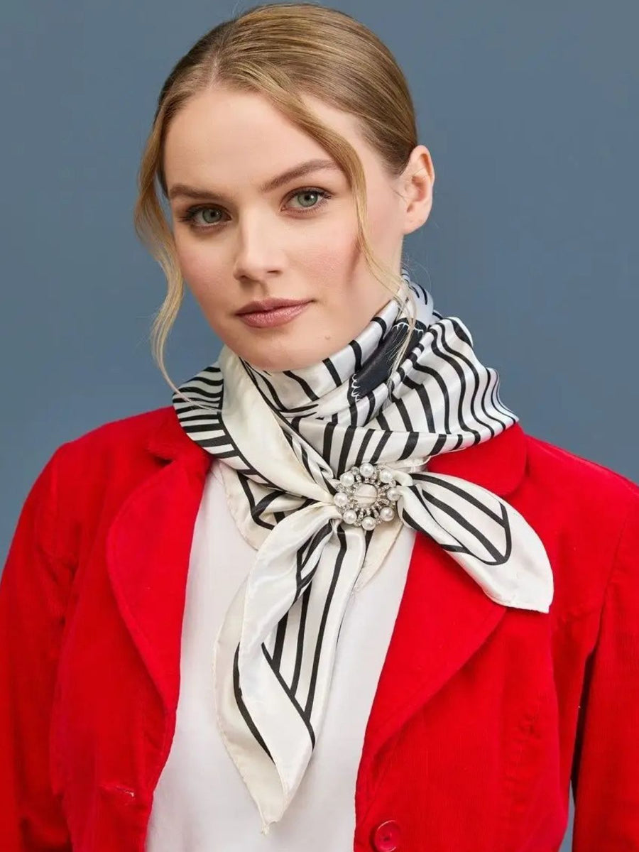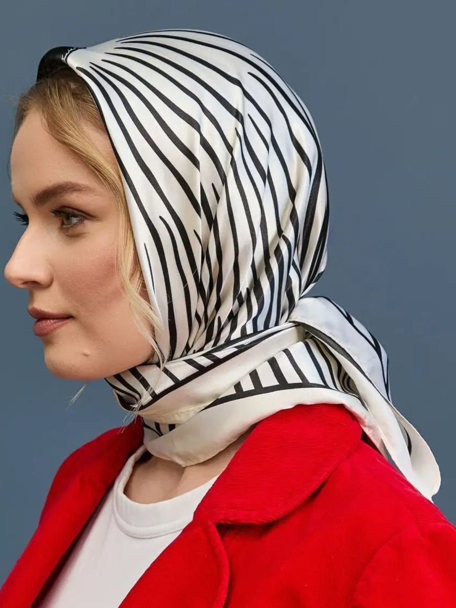 Foulard da donna effetto satinato e setoso, carré nero e bianco, stampa grafica a righe, accessorio per capelli e collo, foulard bandana leggero, modello Leylah