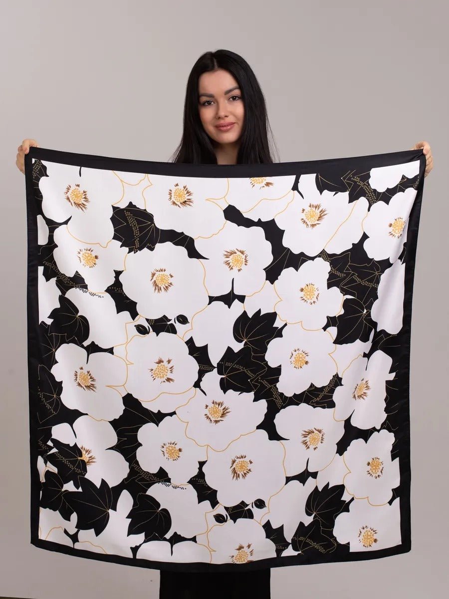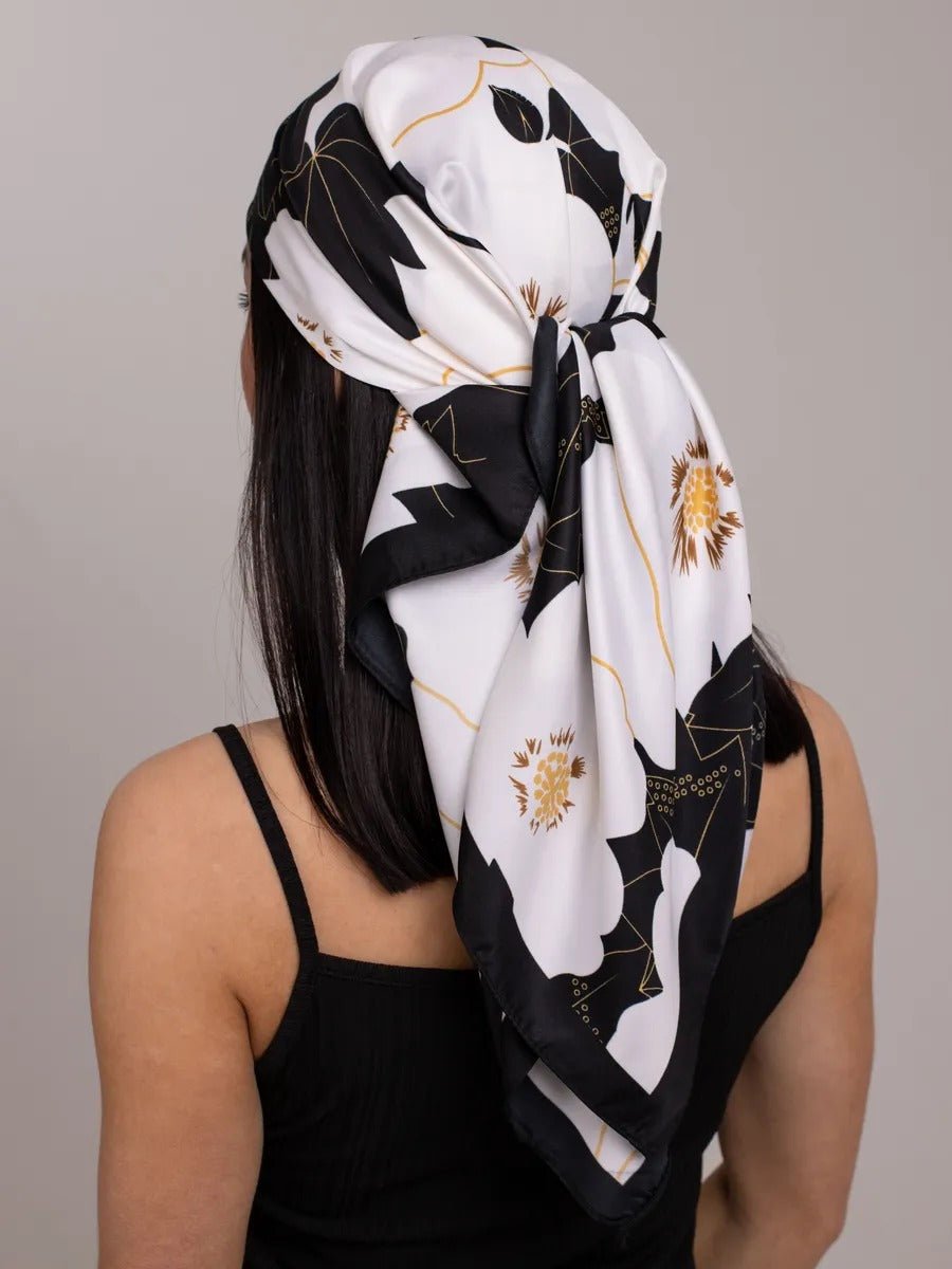 Foulard carré da donna, 90x90, stampa floreale nero bianco dorato, tessuto leggero e setoso, accessorio per borsa o collo, foulard multifunzione estivo, modello Lilo