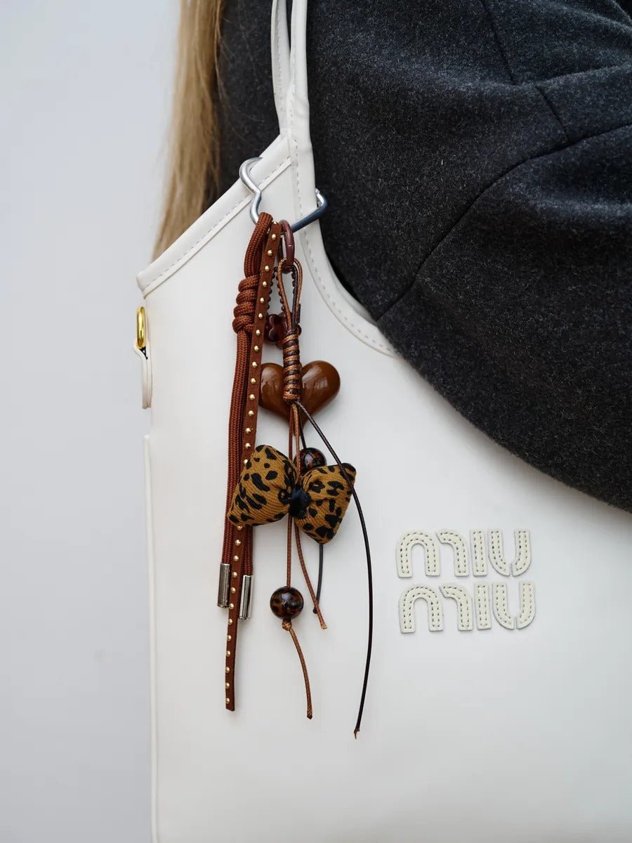 Il suo fiocco in tessuto leopardato aggiunge un tocco felino, mentre i cordoncini intrecciati e le piccole perle in materiale effetto tartaruga arricchiscono la composizione con un raffinato gioco di texture. Ogni elemento è sospeso a una chiusura in metallo argentato a forma di cuore, pratica e decorativa, che consente di agganciarlo facilmente a una borsa, un astuccio o alle chiavi.
