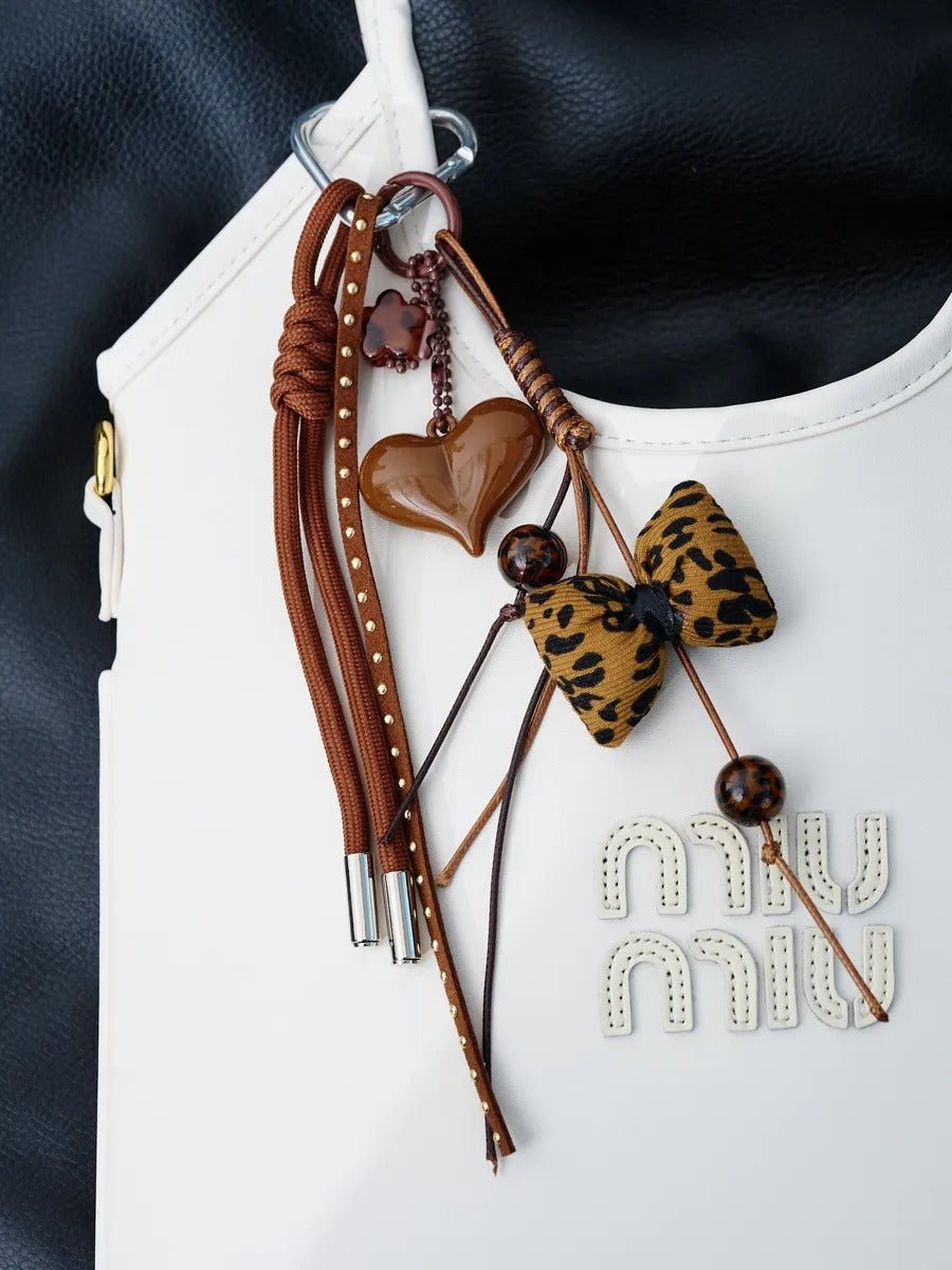 Bijou da borsa cuore, fiocco leopardato, ciondoli marroni, moschettone, accessorio moda, modello Loca