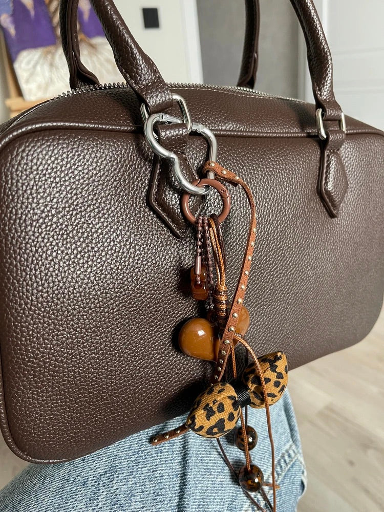 Fate vibrare la vostra borsa con questo bijou da borsa audace dai richiami rétro e animalier. Progettato attorno a un cuore in resina marrone ultra lucido, combina elementi a contrasto che catturano immediatamente lo sguardo.