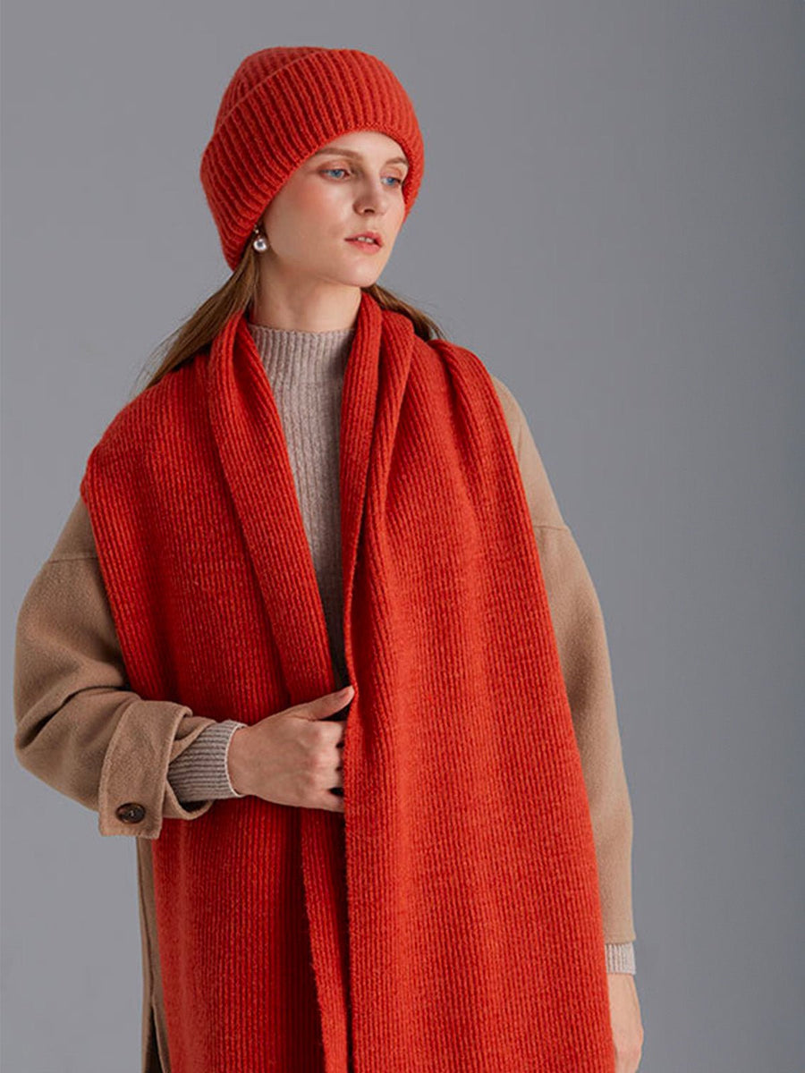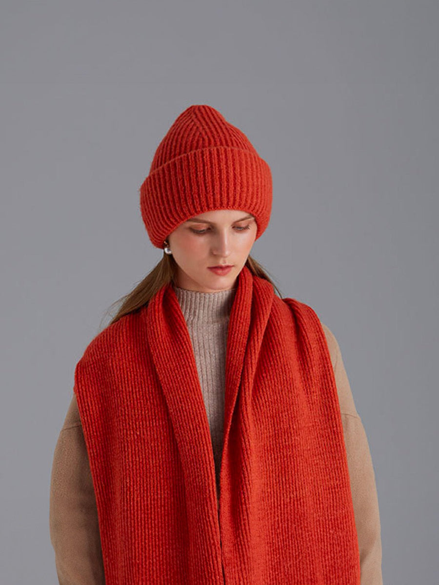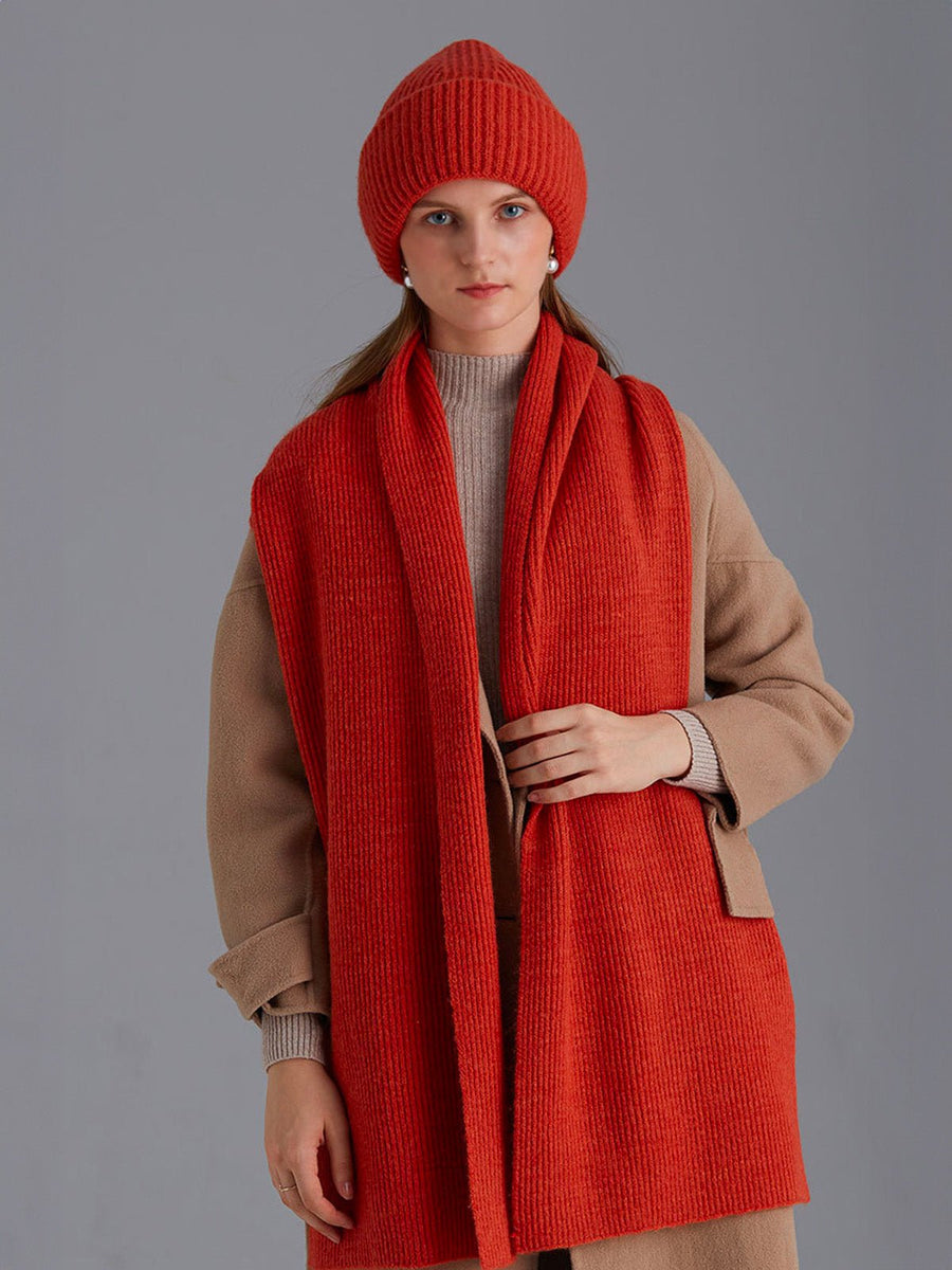 Il berretto presenta una forma arrotondata con risvolto ampio, assicurando una tenuta aderente e una copertura ottimale delle orecchie. La sciarpa, lunga e morbida, si annoda facilmente intorno al collo e offre un calore avvolgente.