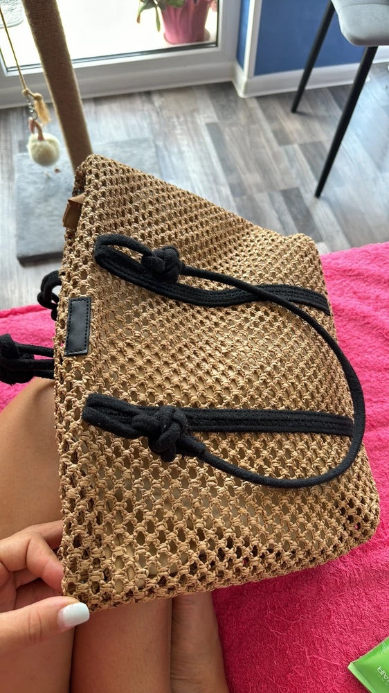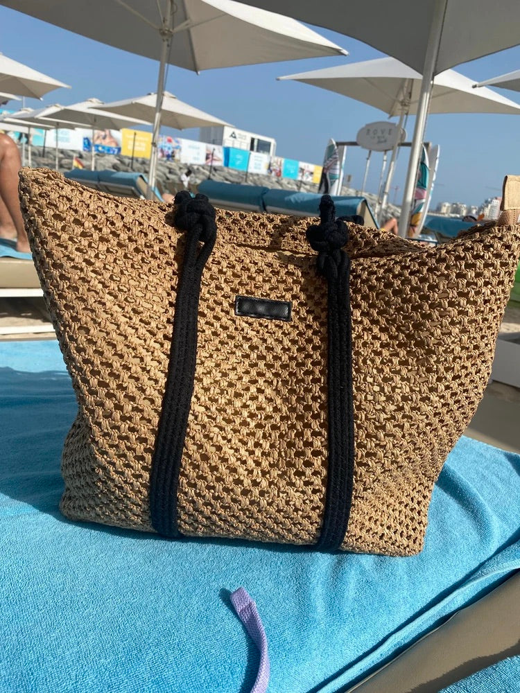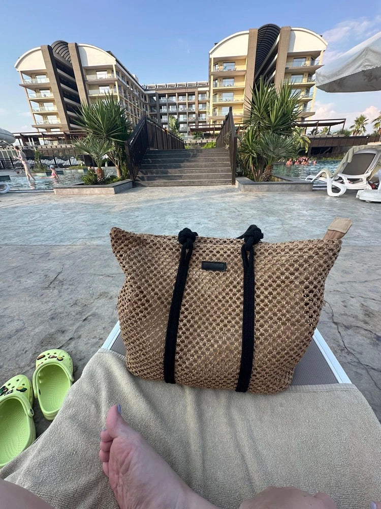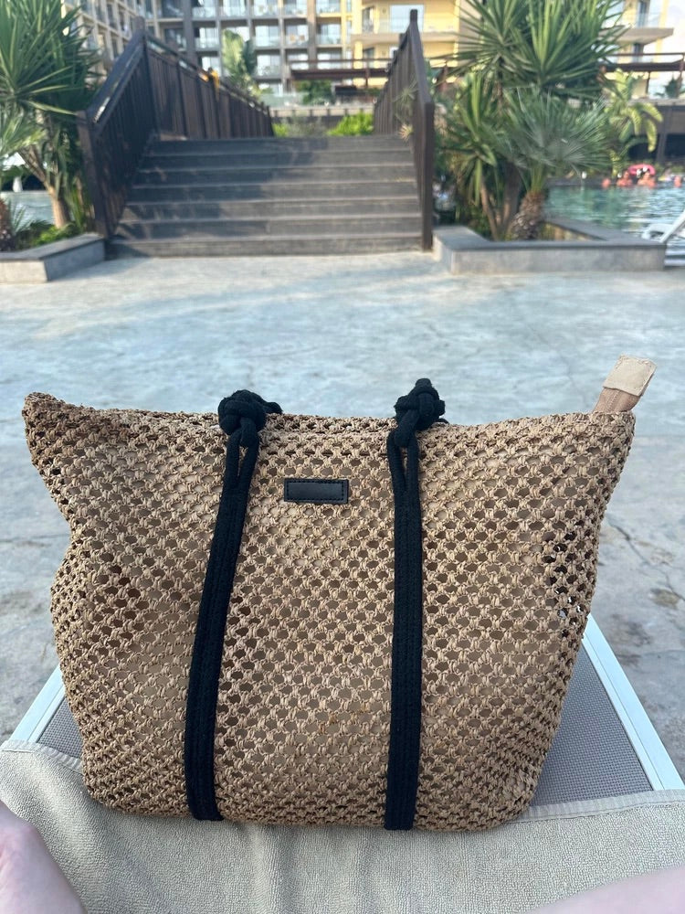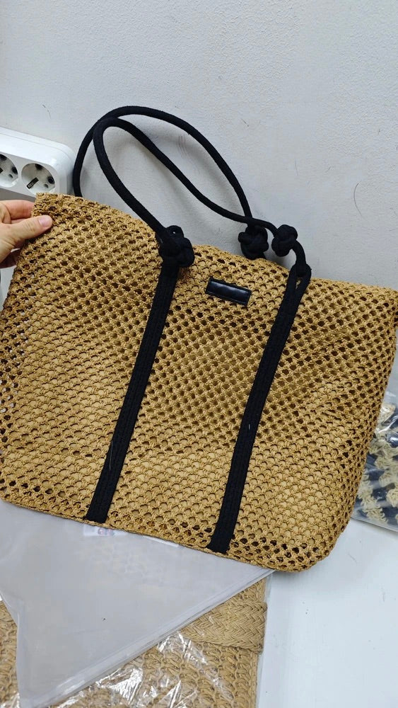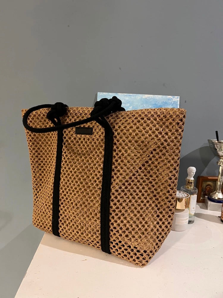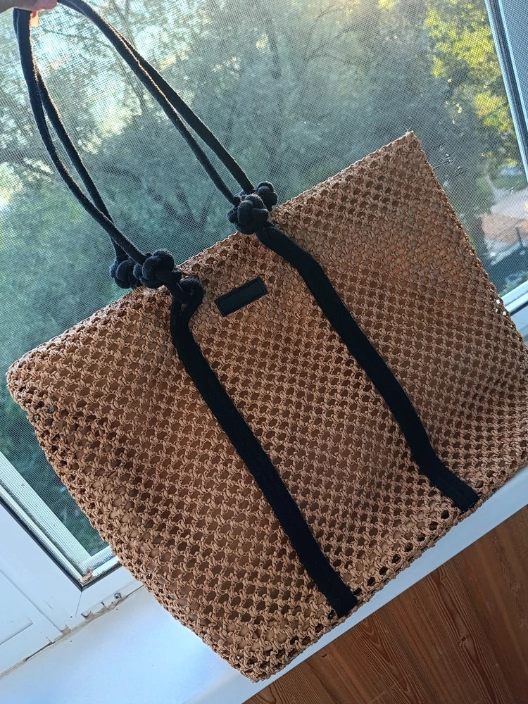 Il design traforato aggiunge un tocco arioso e di tendenza, mantenendo un aspetto naturale grazie ai materiali utilizzati. I lunghi manici in corda nera sono ideali per un trasporto a spalla confortevole.