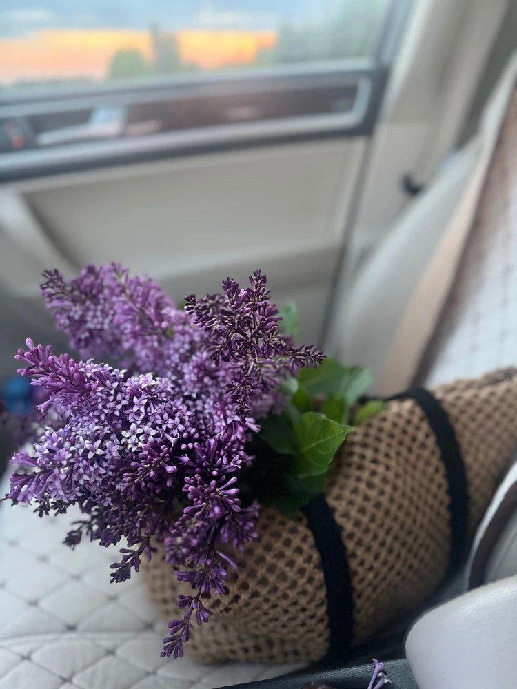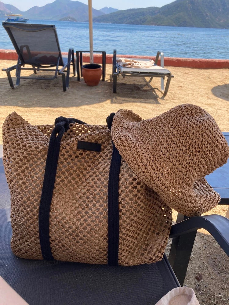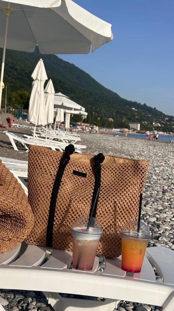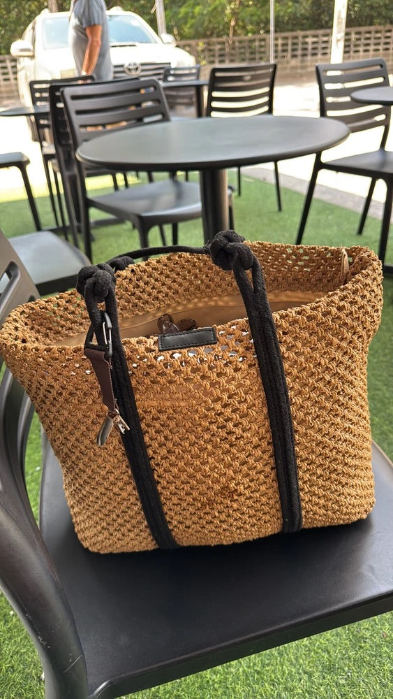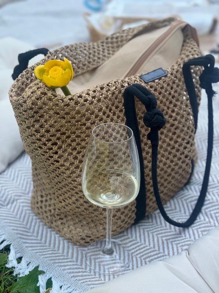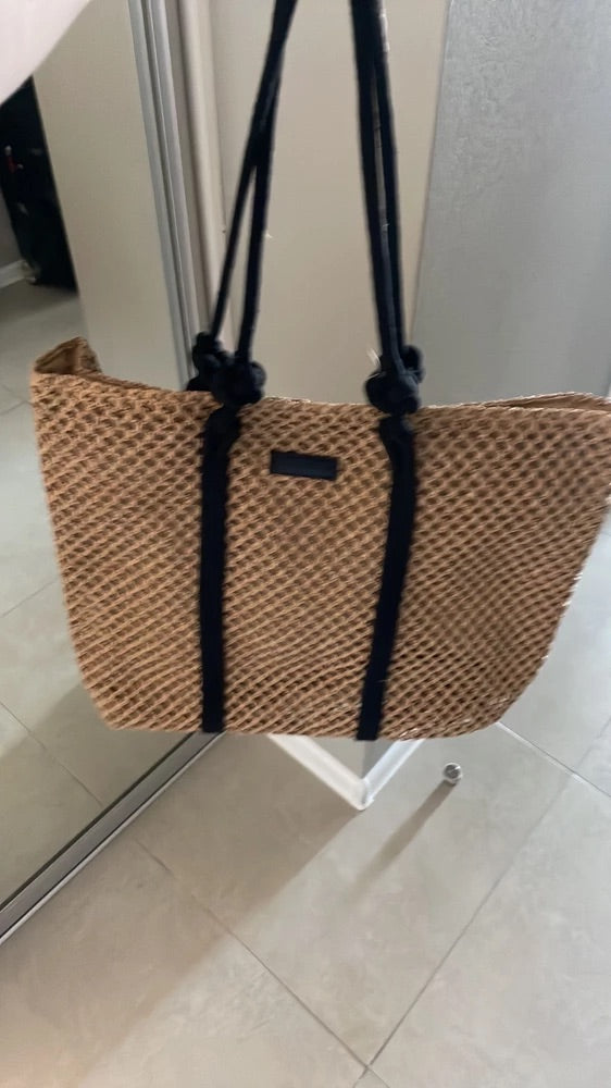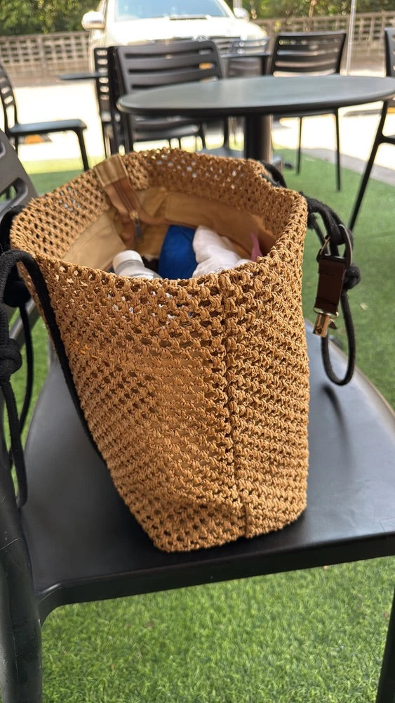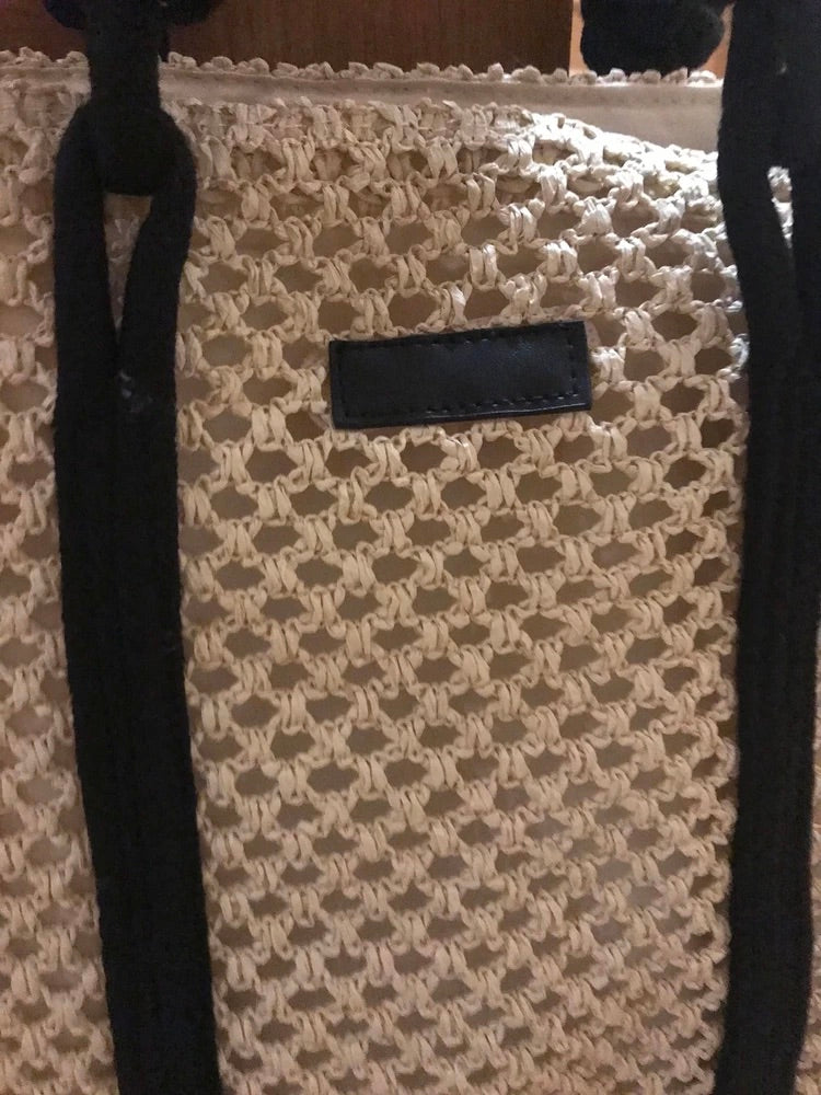 Il design traforato aggiunge un tocco arioso e di tendenza, mantenendo un aspetto naturale grazie ai materiali utilizzati. I lunghi manici in corda nera sono ideali per un trasporto a spalla confortevole.