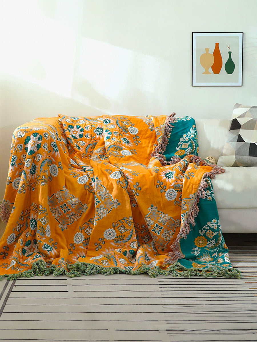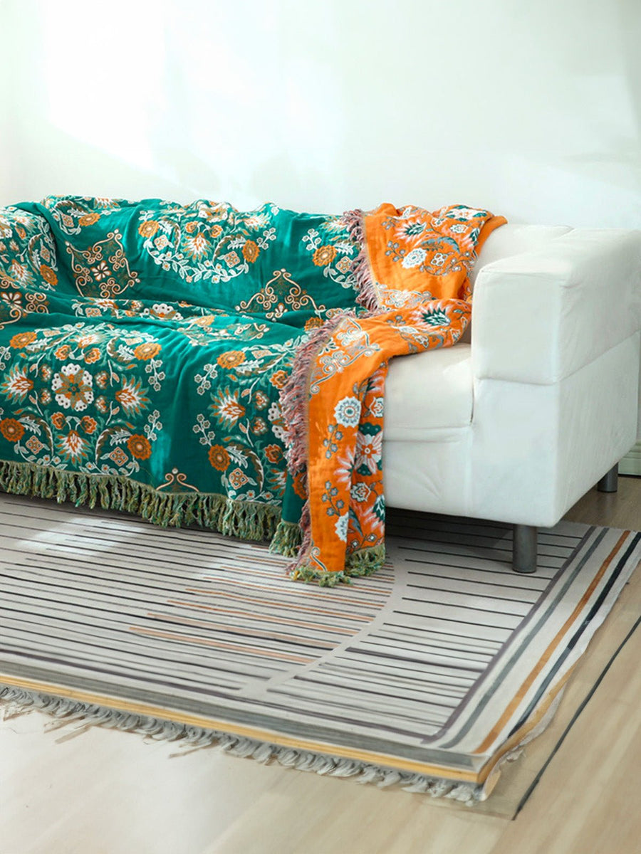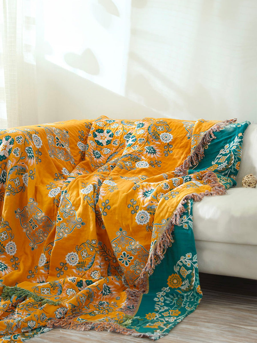 Plaid in cotone stampato floreale, coperta da divano reversibile, plaid decorativo con frange, plaid double face, motivo boho, modello Luanis