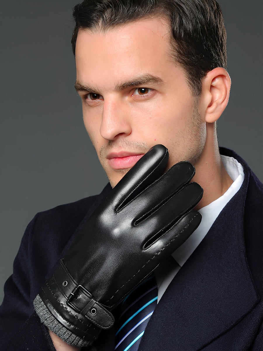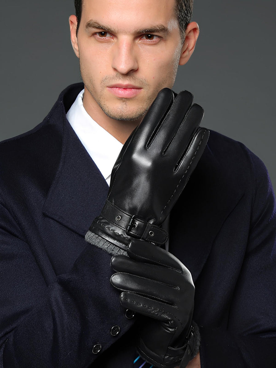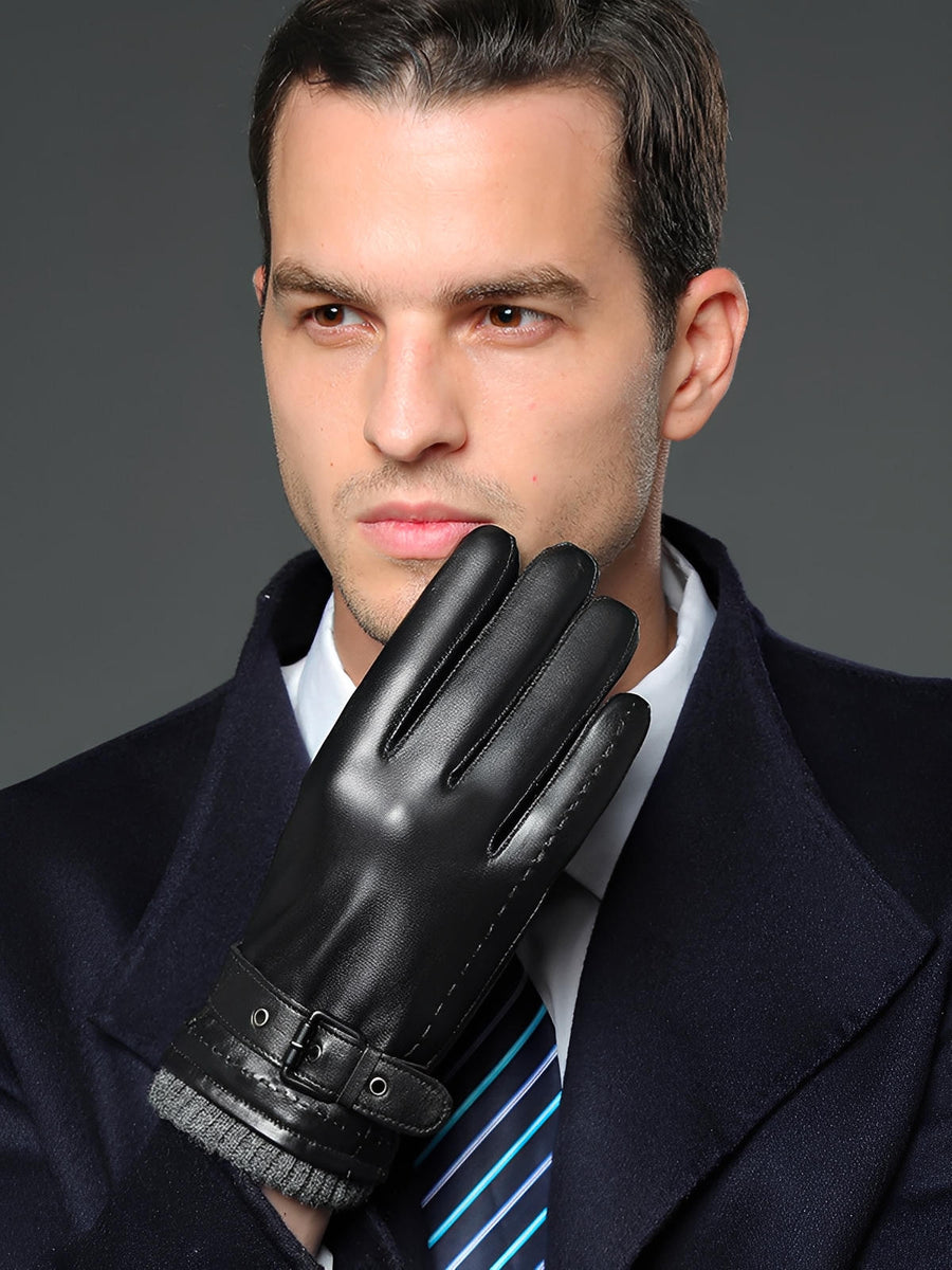 Guanti in pelle da uomo inverno, touch screen per smartphone, fodera calda in lana, chiusura con fibbia regolabile, stile business nero, modello Lucien