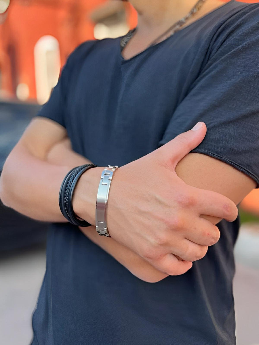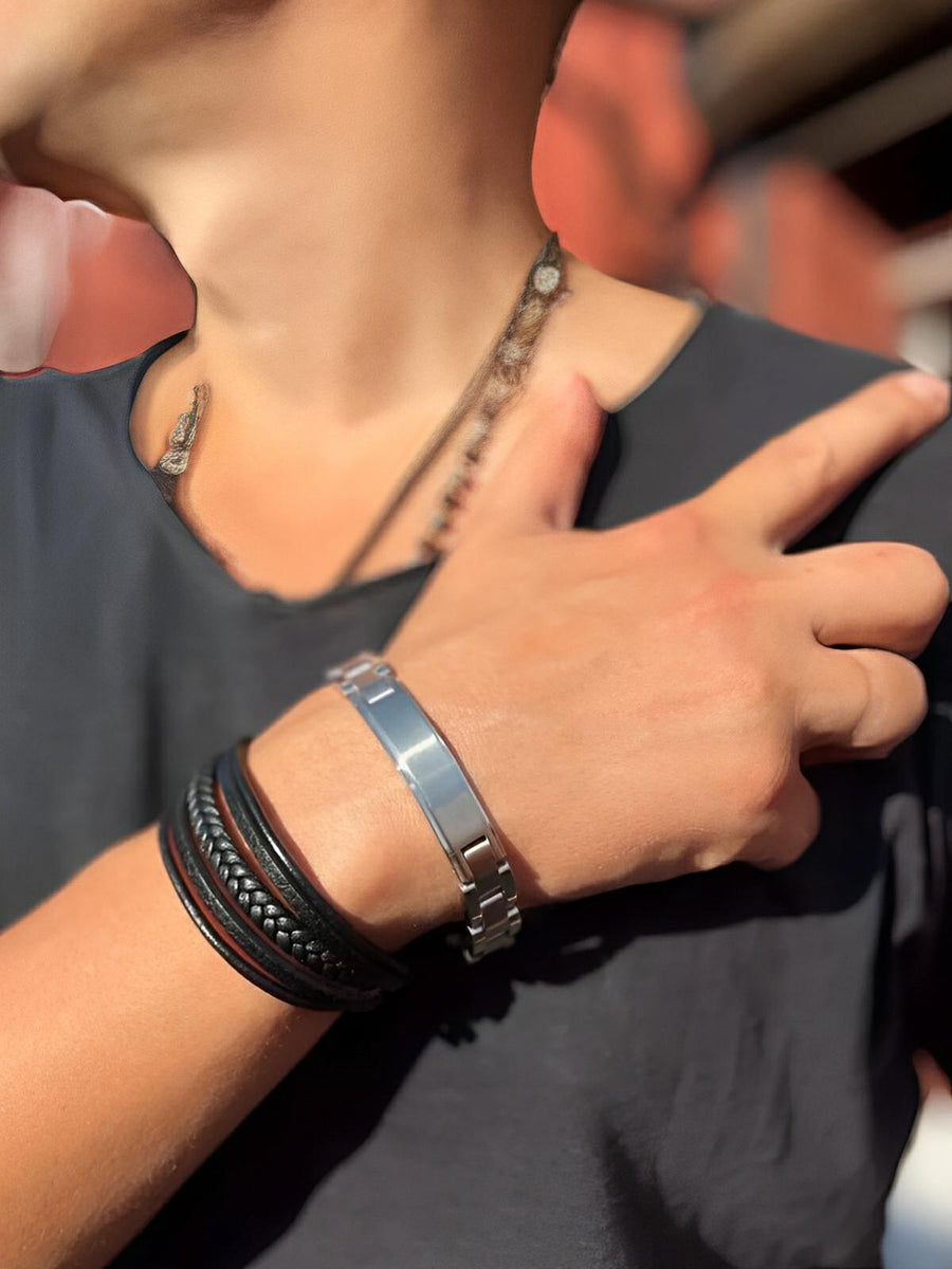 Scoprite un bracciale maschile in acciaio inox 316L, un accessorio sobrio e raffinato che unisce robustezza e modernità. Progettato per gli uomini attenti allo stile, questo bracciale conquista grazie al suo design minimalista e alla finitura a contrasto tra effetto spazzolato e dettagli lucidi.