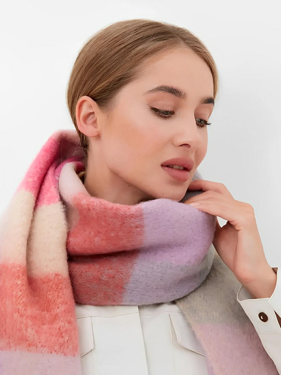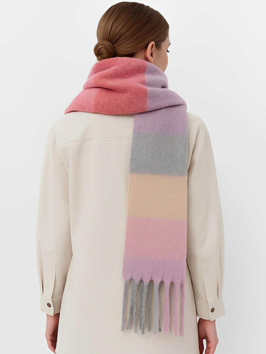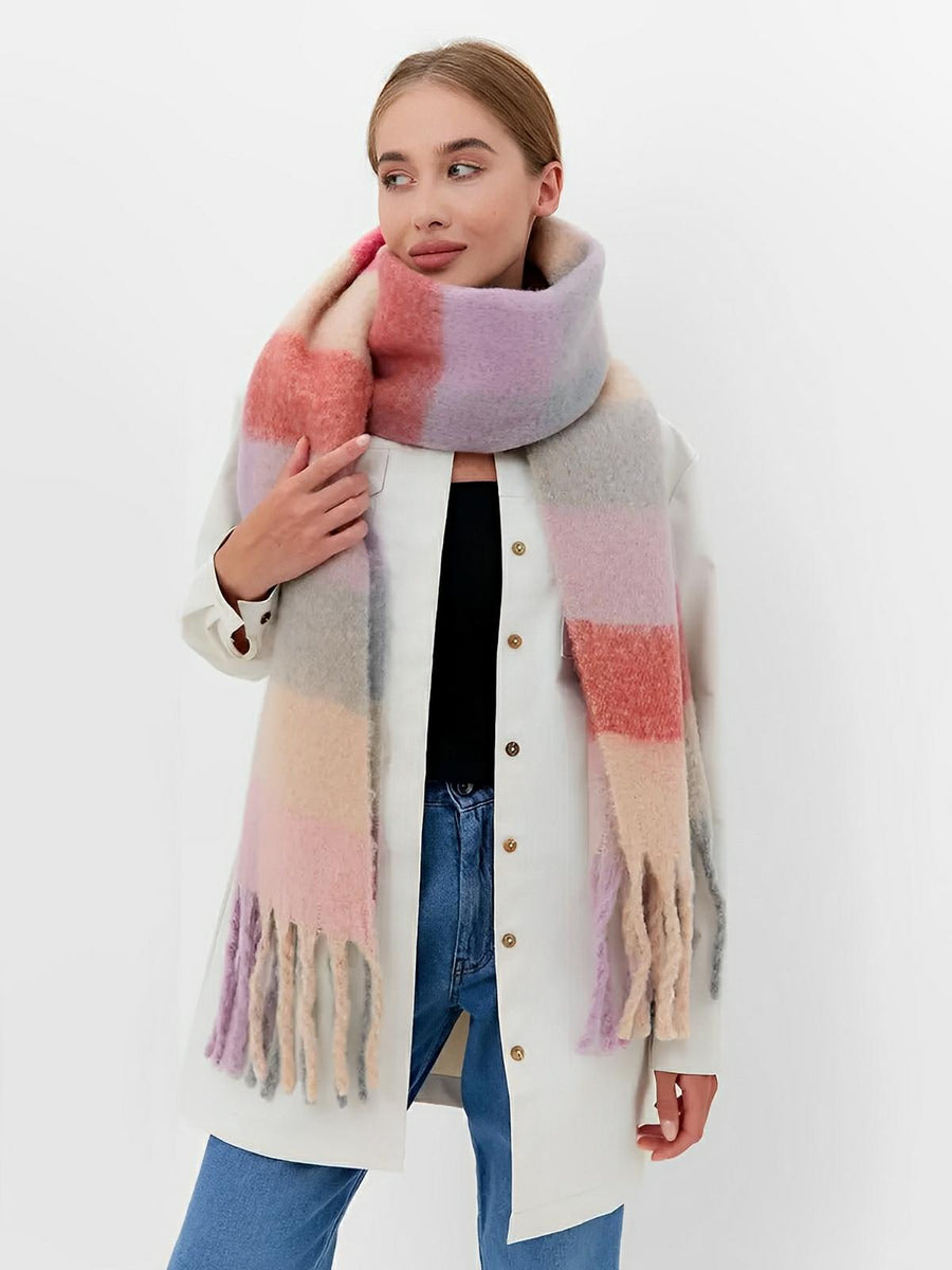 Il motivo plaid multicolore unisce delicate tonalità di lilla, corallo, crema e grigio perla, per abbinarsi sia a una giacca classica che a un cappotto oversize o a un piumino contemporaneo. Le sue lunghe frange mobili aggiungono un tocco di movimento alla vostra silhouette.