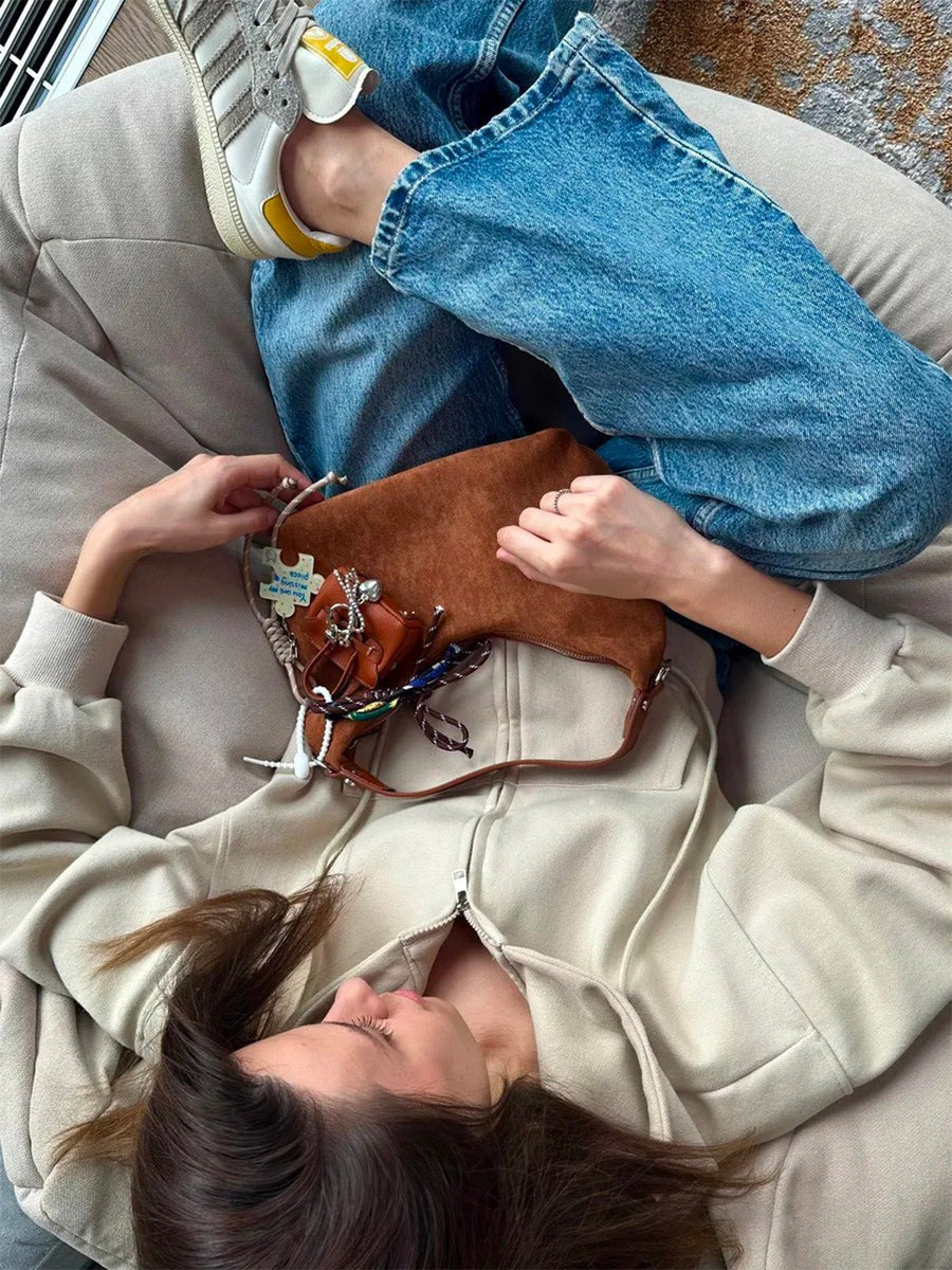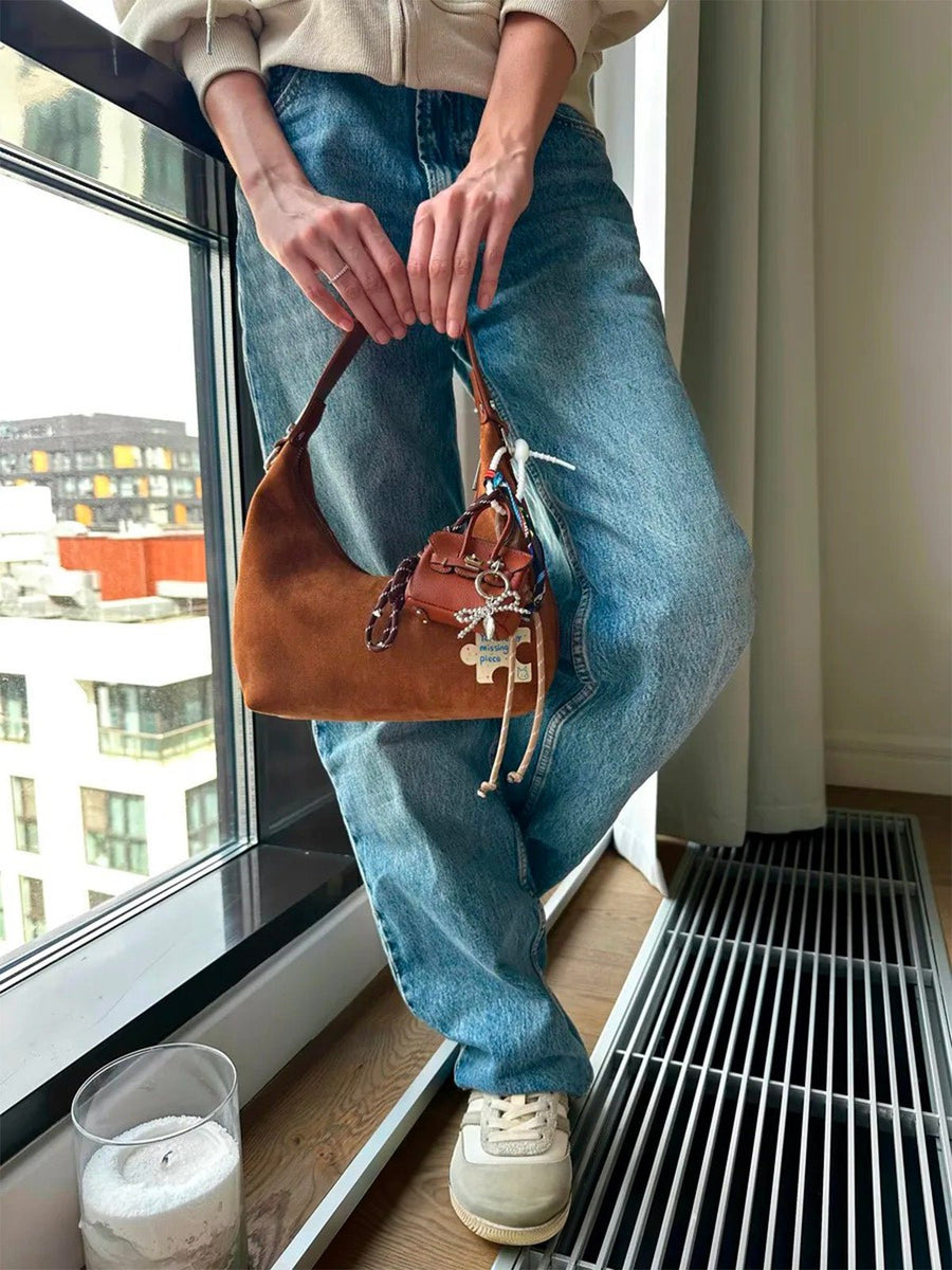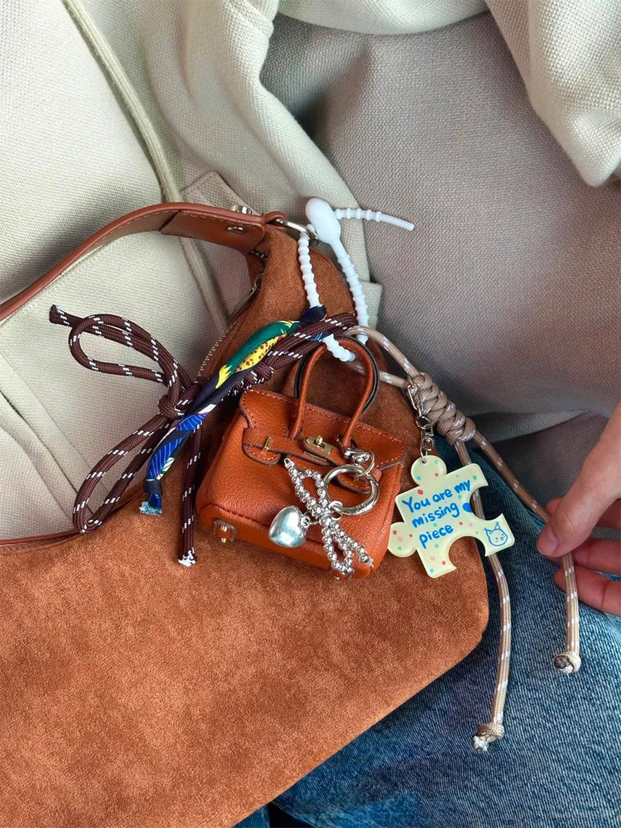 Aggiungete un tocco di stile giocoso alla vostra borsa con questo bijou da borsa unico nel suo genere. Pensato come una composizione visiva ricca, si distingue per una mini-borsa in similpelle marrone, ispirata ai modelli iconici in stile Birkin. Ogni dettaglio conta: un ciondolo a forma di cuore metallico sospeso a un nodo di perle, un puzzle pastello inciso con il messaggio "You are my missing piece" e cordoncini intrecciati dalle finiture curate.