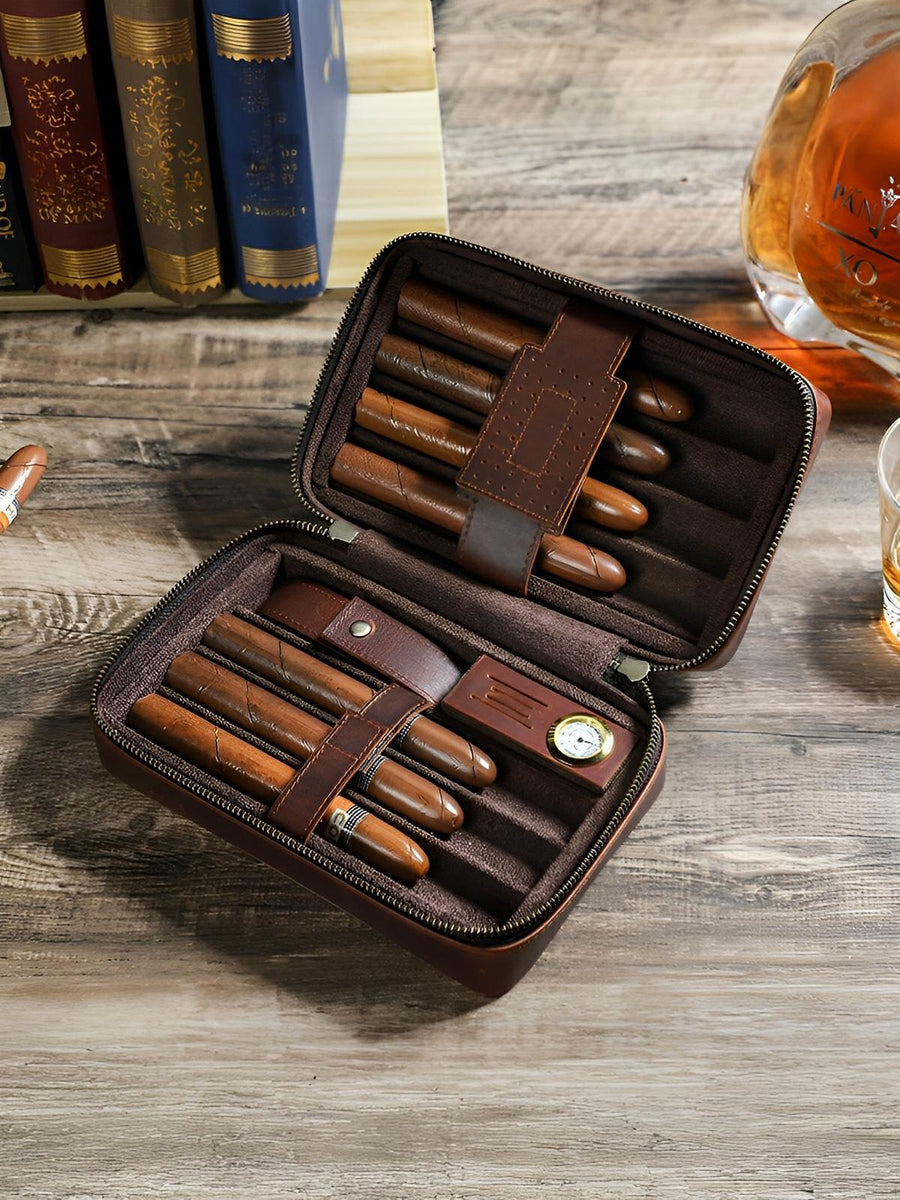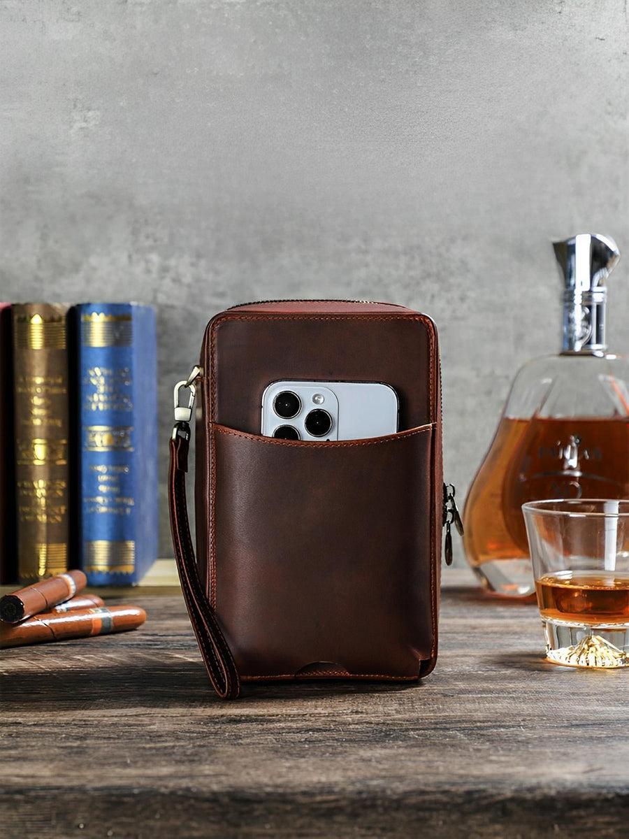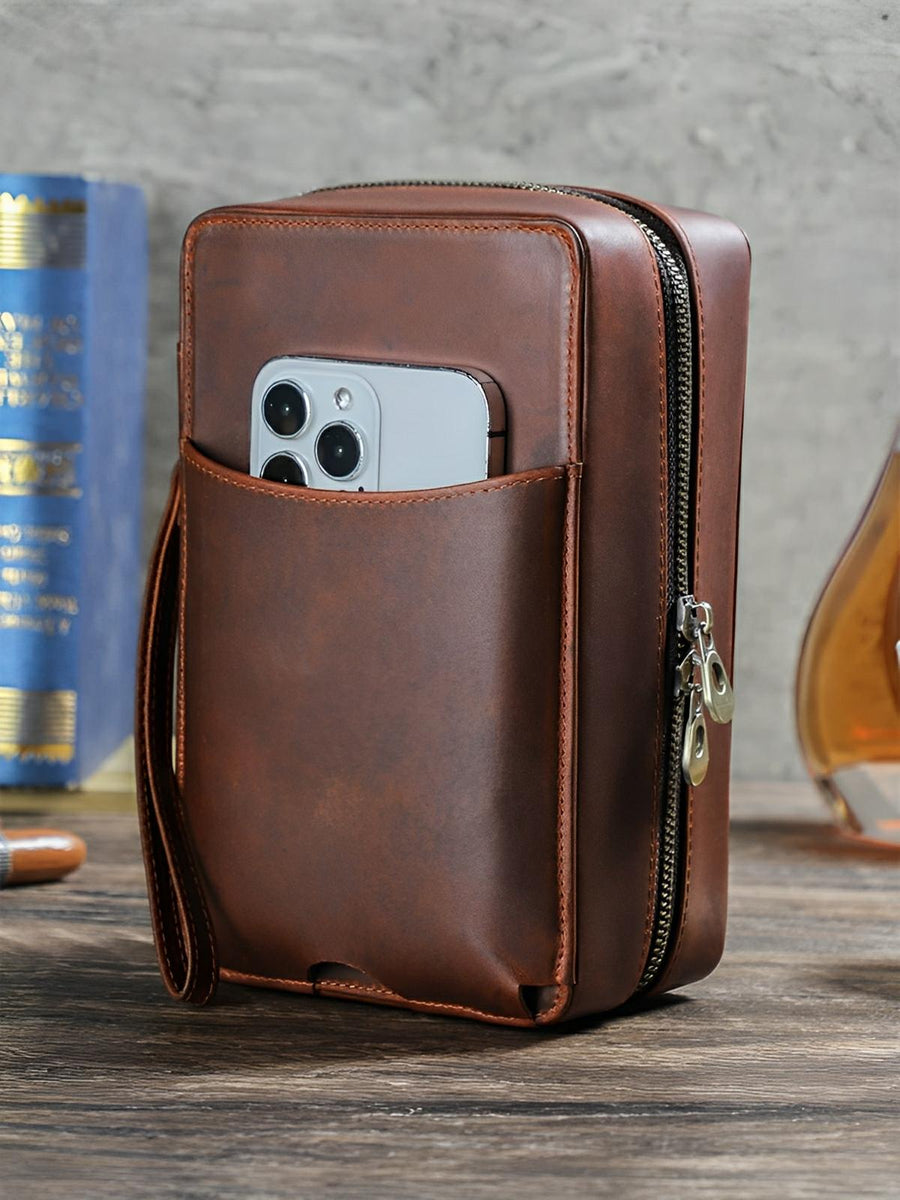 Compatta ed elegante, questa cantinetta per sigari dispone di un laccetto in pelle per un trasporto agevole. Una tasca esterna consente di riporre telefono e documenti essenziali. Che sia per uso personale o come regalo raffinato, questa cantinetta è un accessorio indispensabile per gli appassionati di sigari.