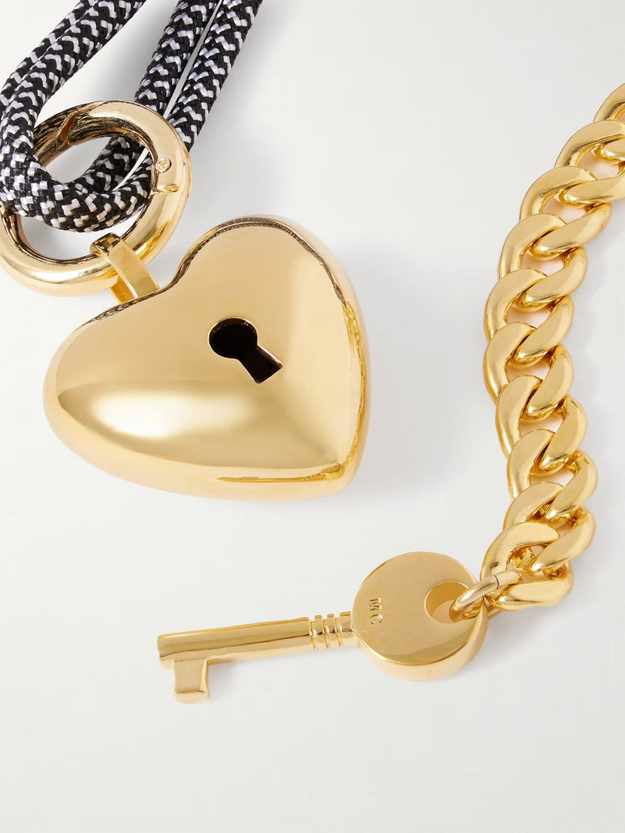 Il suo moschettone consente di agganciarlo a qualsiasi borsa o portachiavi. Il contrasto tra la corda tessile nera e bianca e il metallo dorato lucido aggiunge un tocco grafico audace. Il lucchetto a forma di cuore, impreziosito da un dettaglio serratura discreto, evoca un fascino simbolico, perfetto da regalare o per concedersi un piacere personale.
