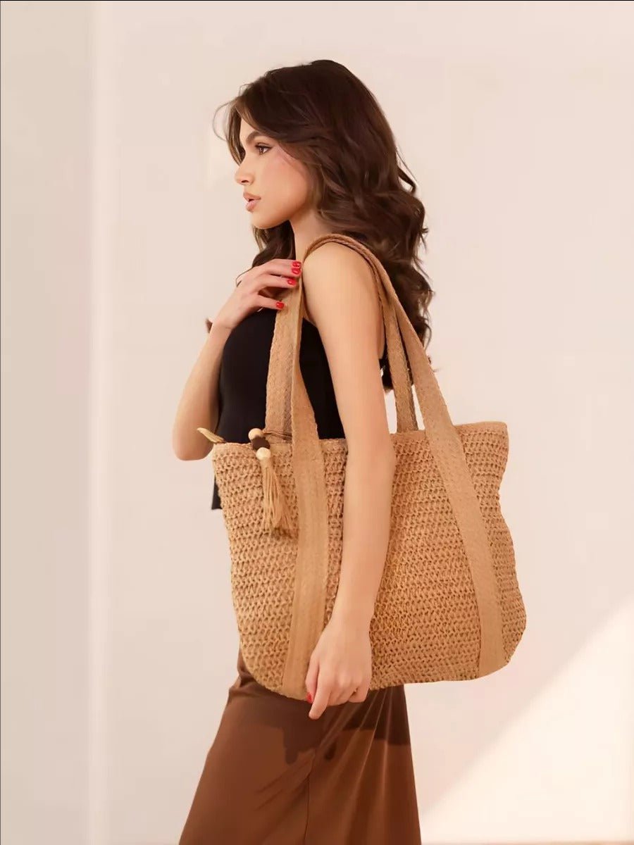 Affermate il vostro stile casual e responsabile con questa borsa tote-bag in paglia intrecciata, perfetta combinazione di funzionalità e naturalezza per l’estate.