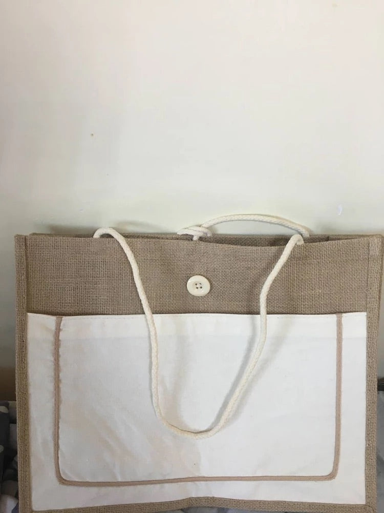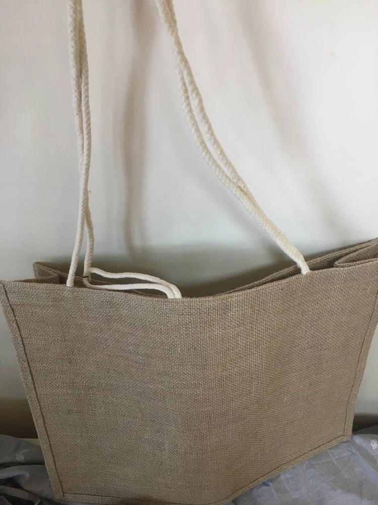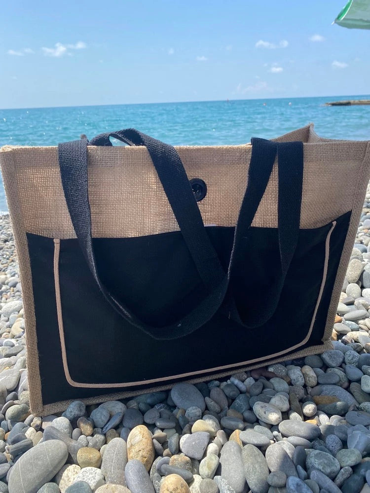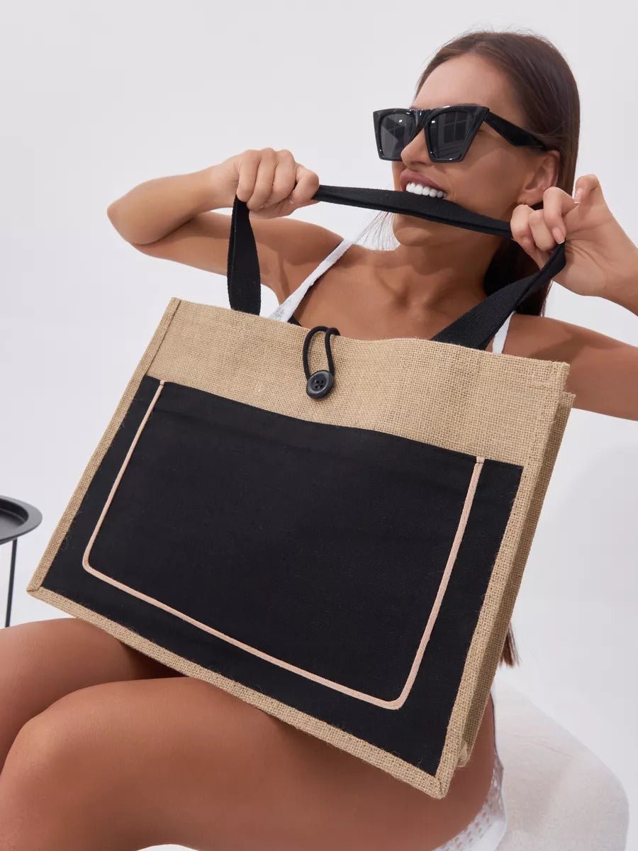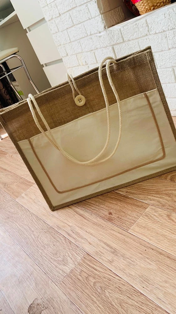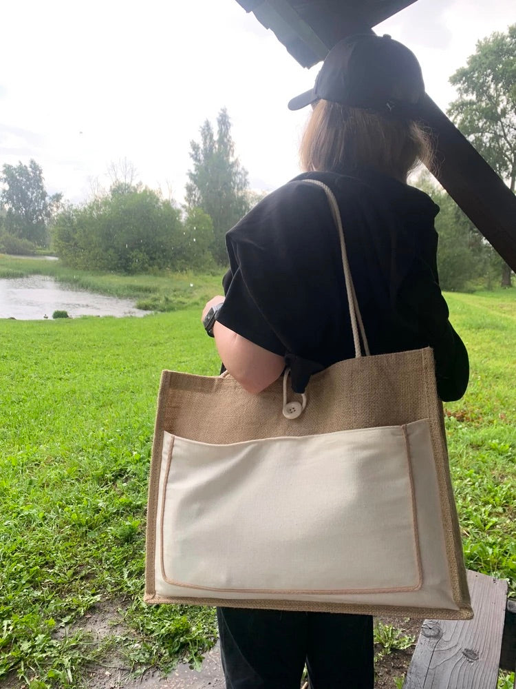 Borsa da spiaggia shopper in tela di juta, grande formato, chiusura con bottone, manici lunghi, borsa a mano da esterno, tote-bag per le vacanze, modello Maya