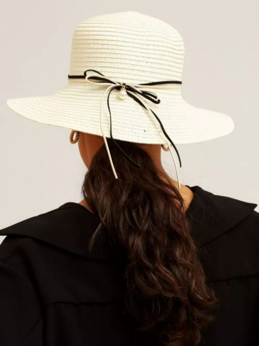 Un nastro bicolore ornato da una perla aggiunge un tocco raffinato all’insieme. Questo dettaglio decorativo non è solo estetico: contribuisce a mantenere il cappello ben saldo, anche in riva al mare o con una leggera brezza.