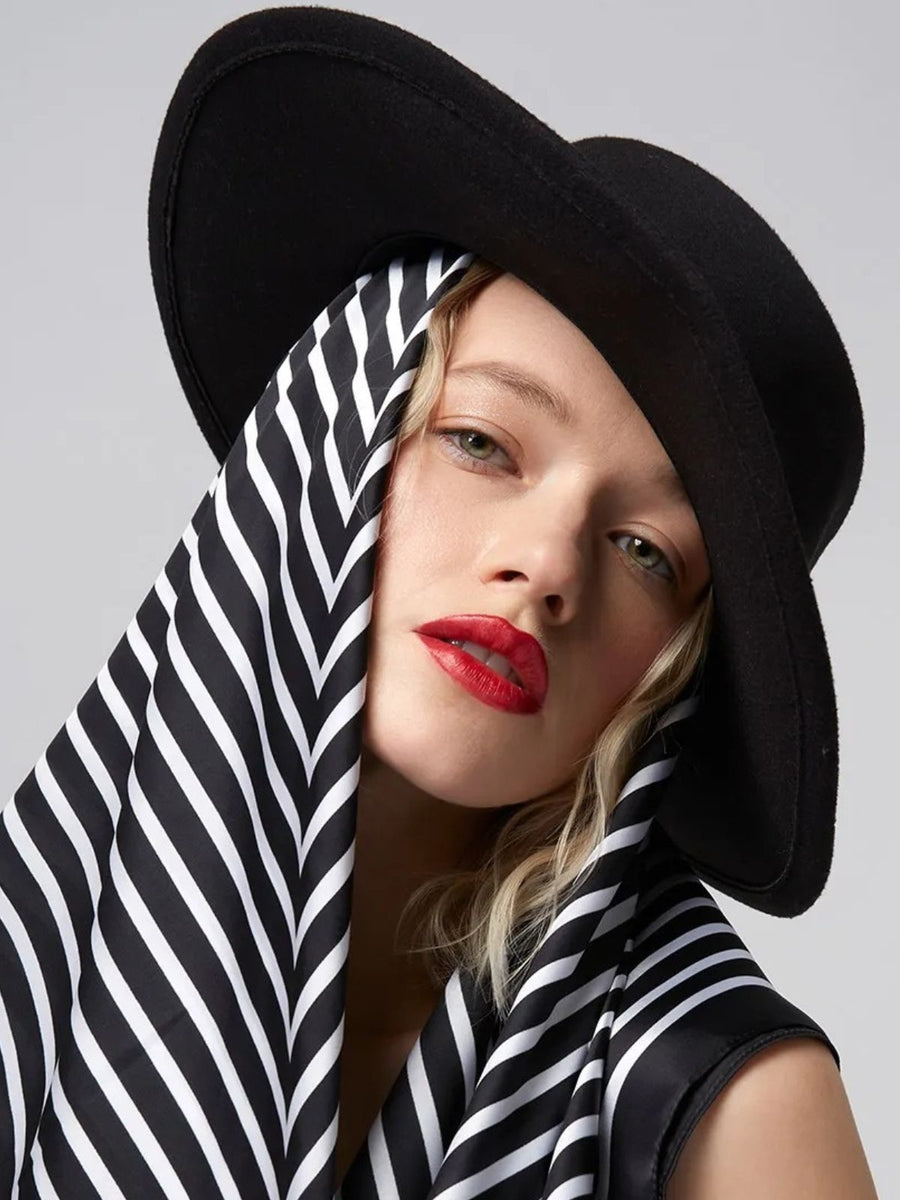 Questo foulard offre una palette sobria di nero e bianco valorizzata da un motivo a righe ipnotico che attira lo sguardo con discrezione. Si distingue per la sua morbidezza al tatto e la sua caduta fluida, aggiungendo un tocco di raffinatezza a qualsiasi outfit.