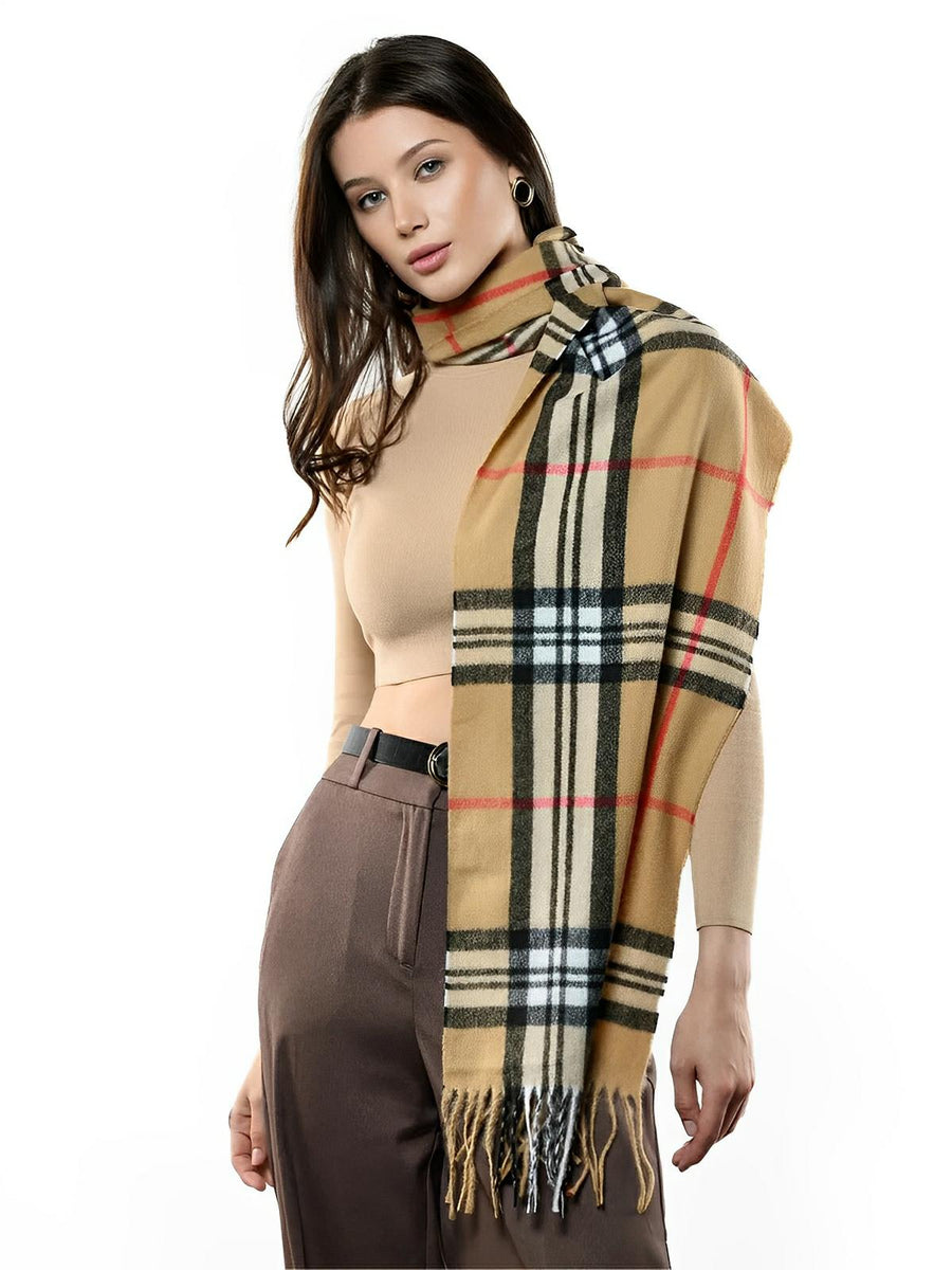 Sciarpa 100% lana di pecora, a quadri, calda e morbida, accessorio invernale unisex con finitura con frange, modello Naorie