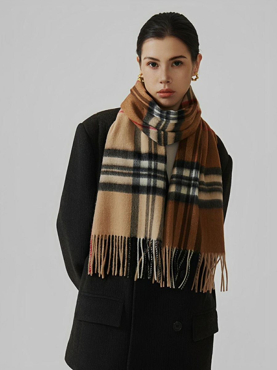 Con le sue frange intrecciate su ogni estremità e il suo motivo a quadri iconico, questa sciarpa rappresenta l’accessorio perfetto per completare un cappotto tinta unita o una giacca strutturata. La sua generosa lunghezza di 190 cm consente di annodarla in diversi modi: portata morbida, avvolta o incrociata intorno al collo.