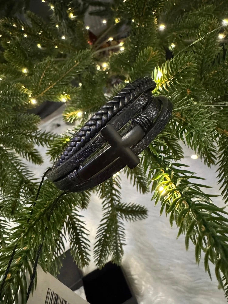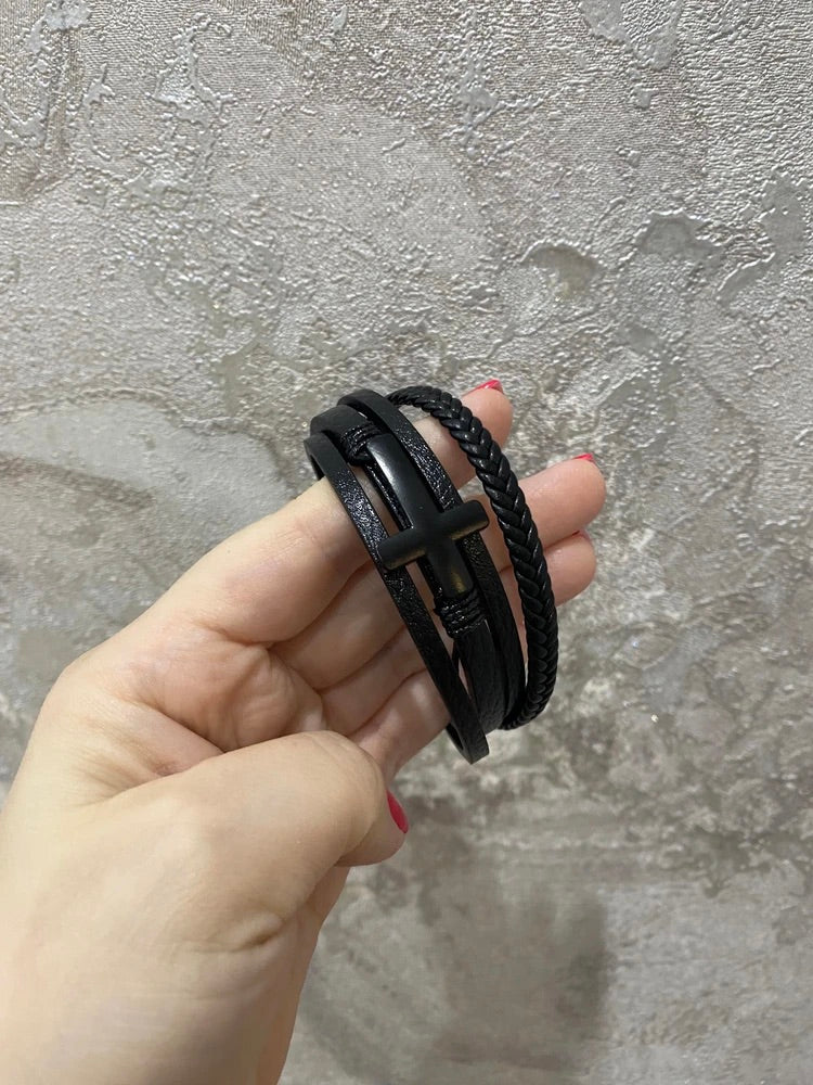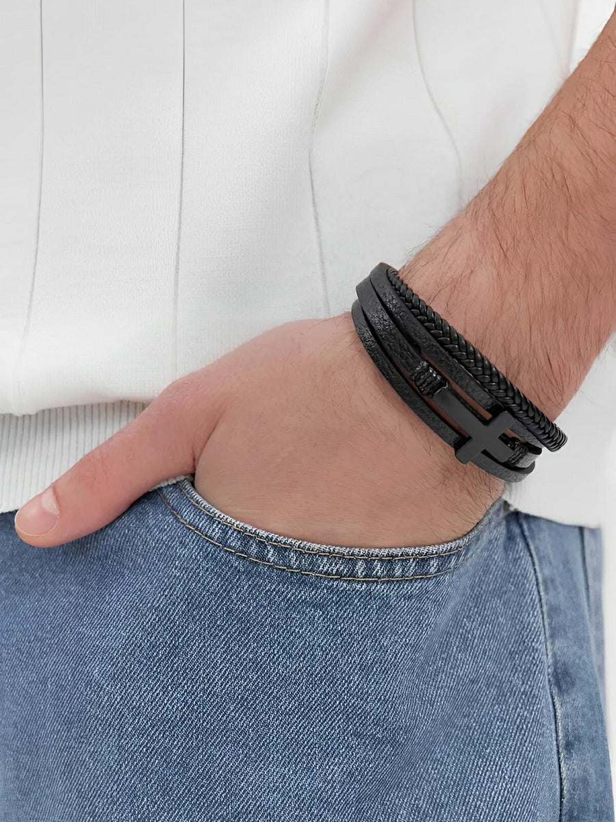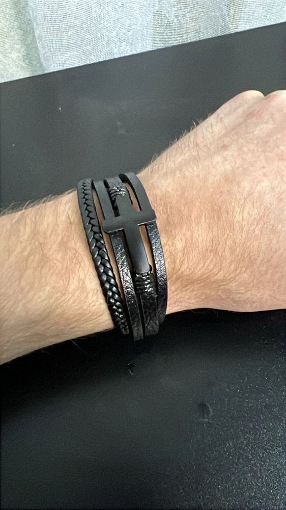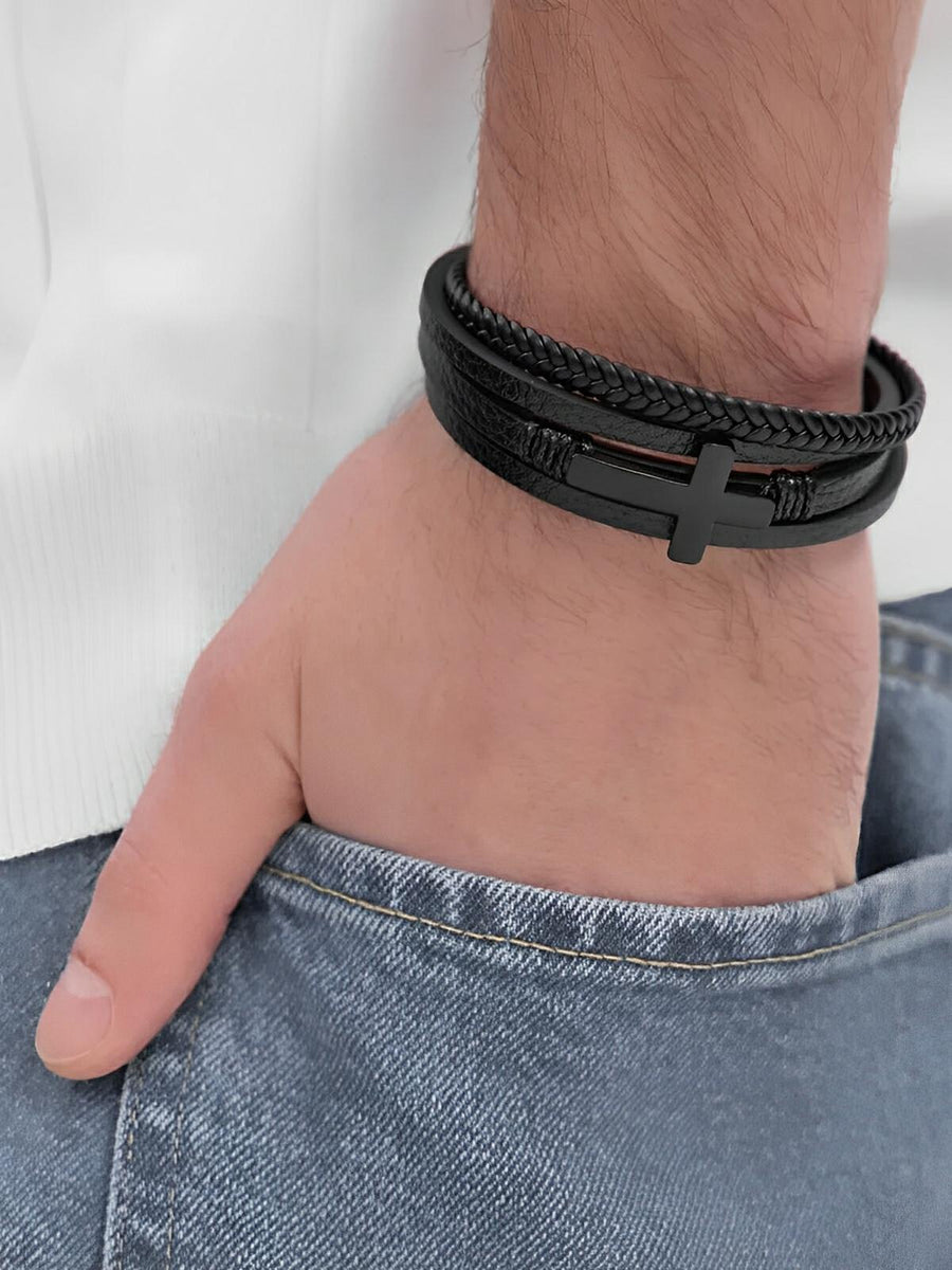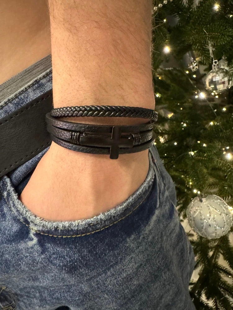 Bracciale in pelle multigiro da uomo, croce cristiana in metallo, accessorio di tendenza, modello Narcisse