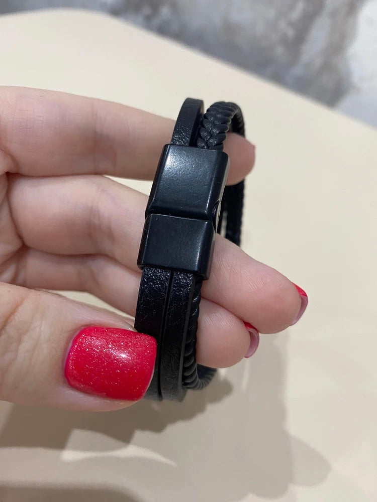 Affermate il vostro stile con questo bracciale in pelle multigiro, pensato per gli uomini che cercano un accessorio al tempo stesso robusto e di tendenza. Il suo design intrecciato e le diverse texture della pelle aggiungono rilievo e carattere al vostro polso.