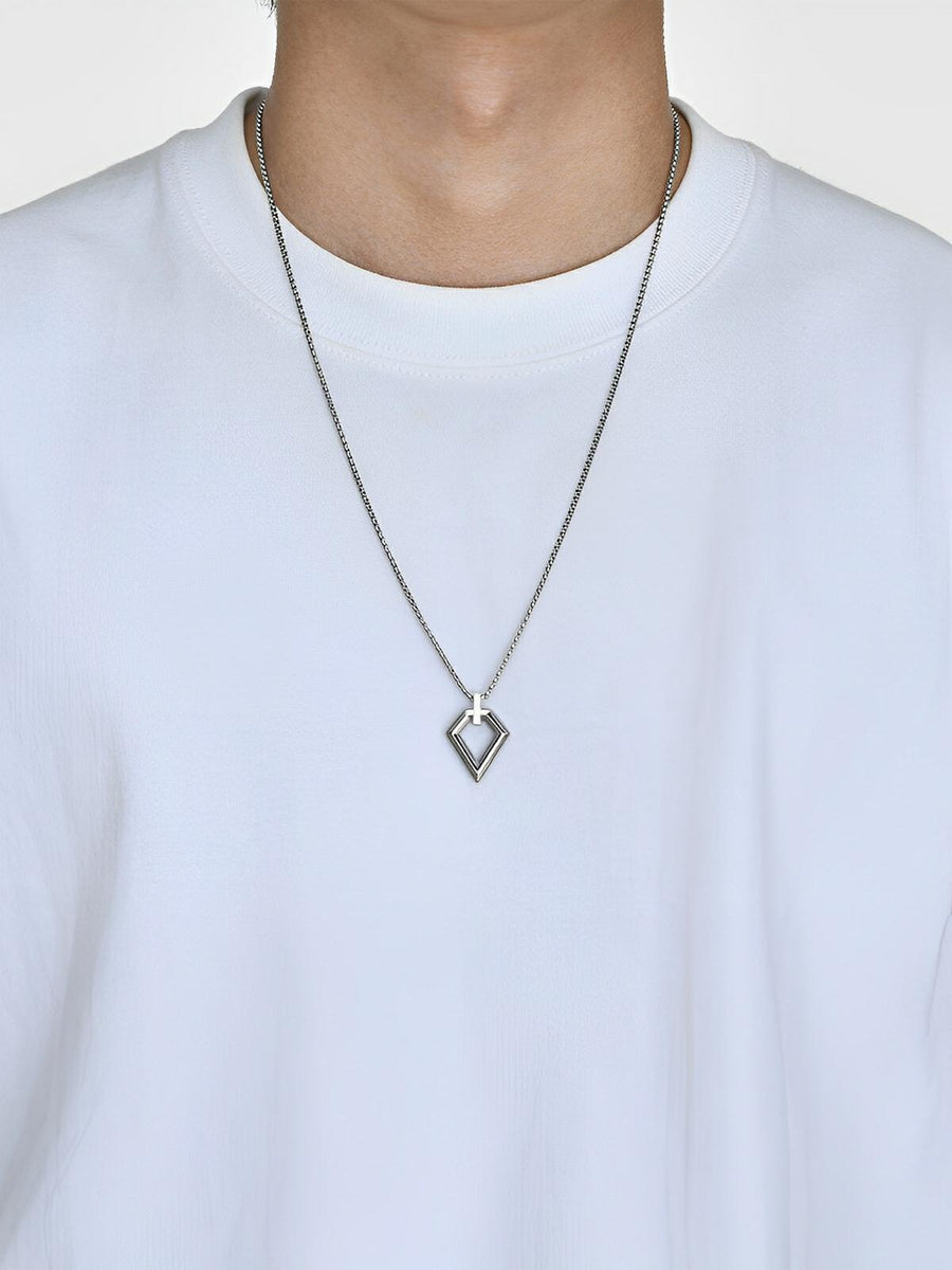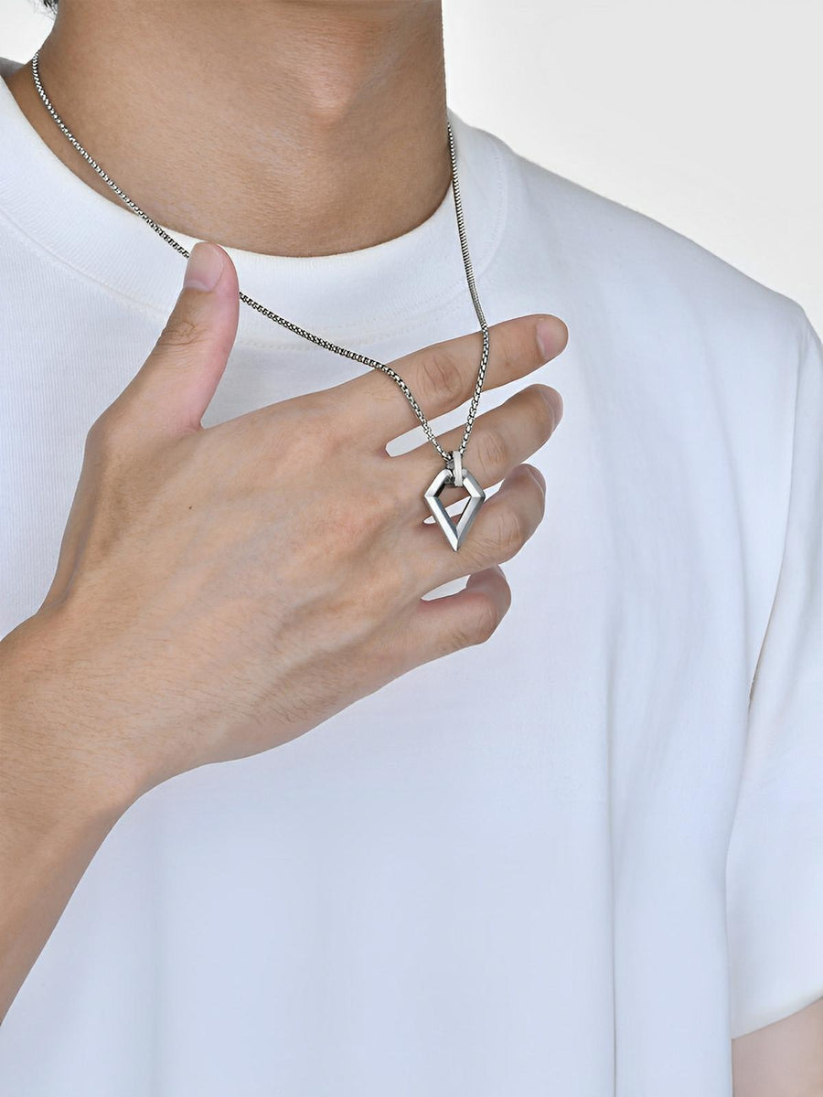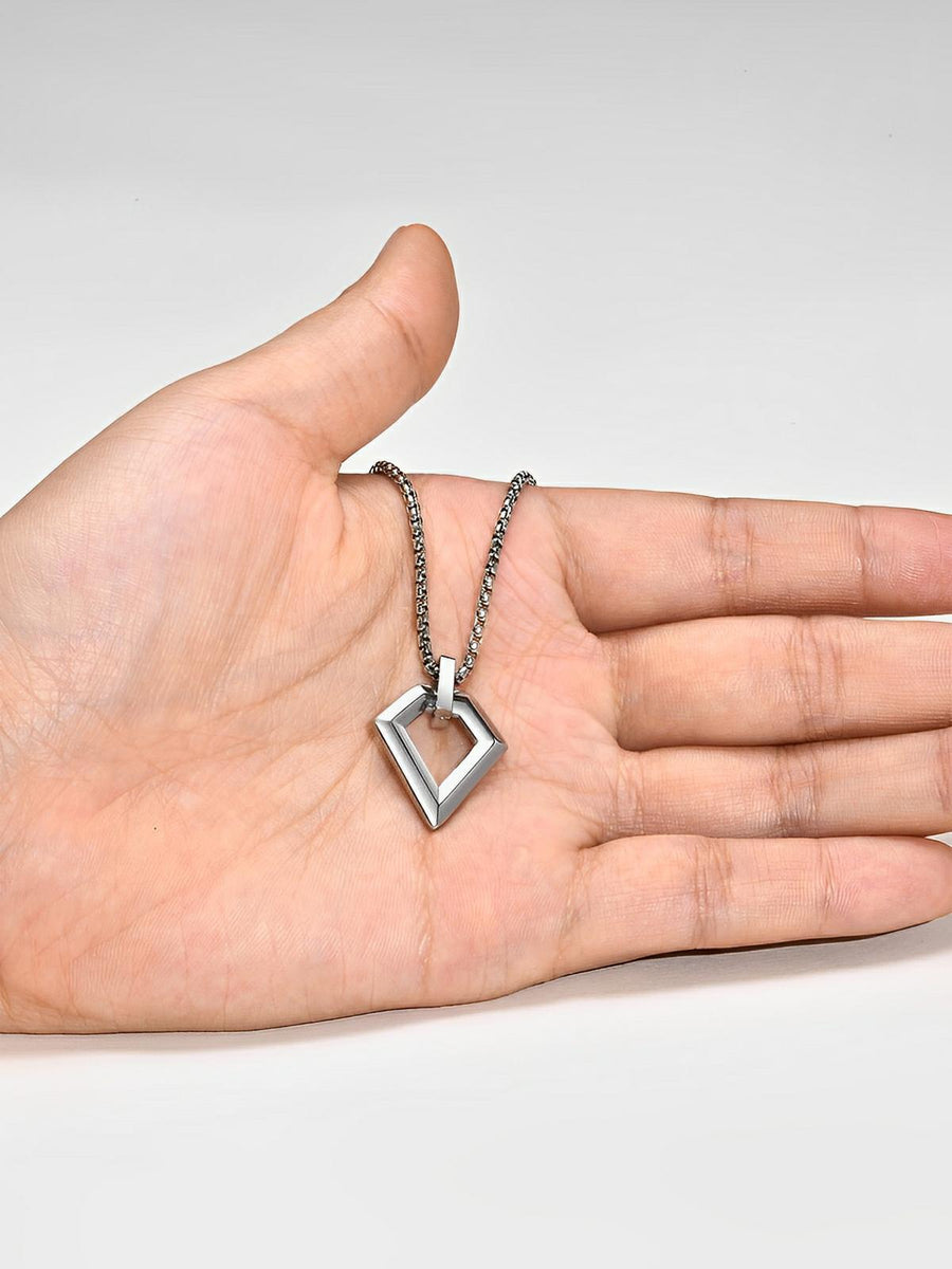 Il suo pendente dalla forma geometrica sofisticata, delle dimensioni di 2,75 x 2 cm, è sospeso a una catena a maglia veneziana di 60 cm, offrendo un equilibrio perfetto tra modernità e raffinatezza. Con un peso di soli 4g, questa collana si indossa comodamente per tutta la giornata.