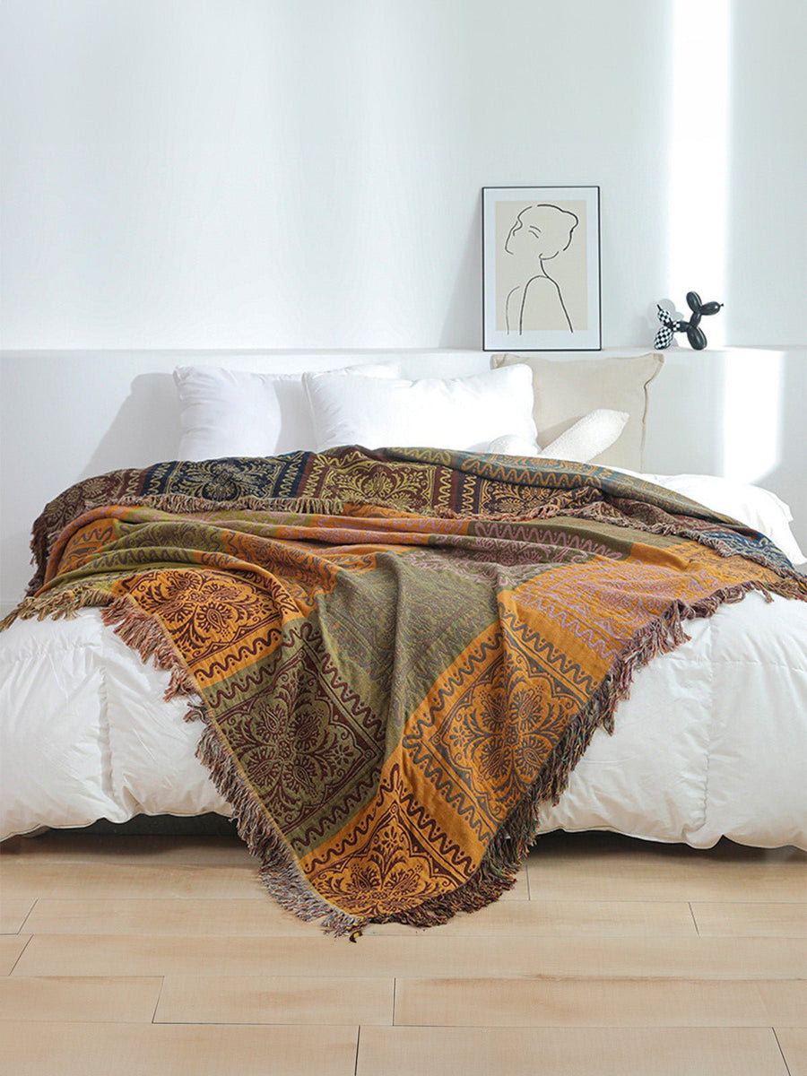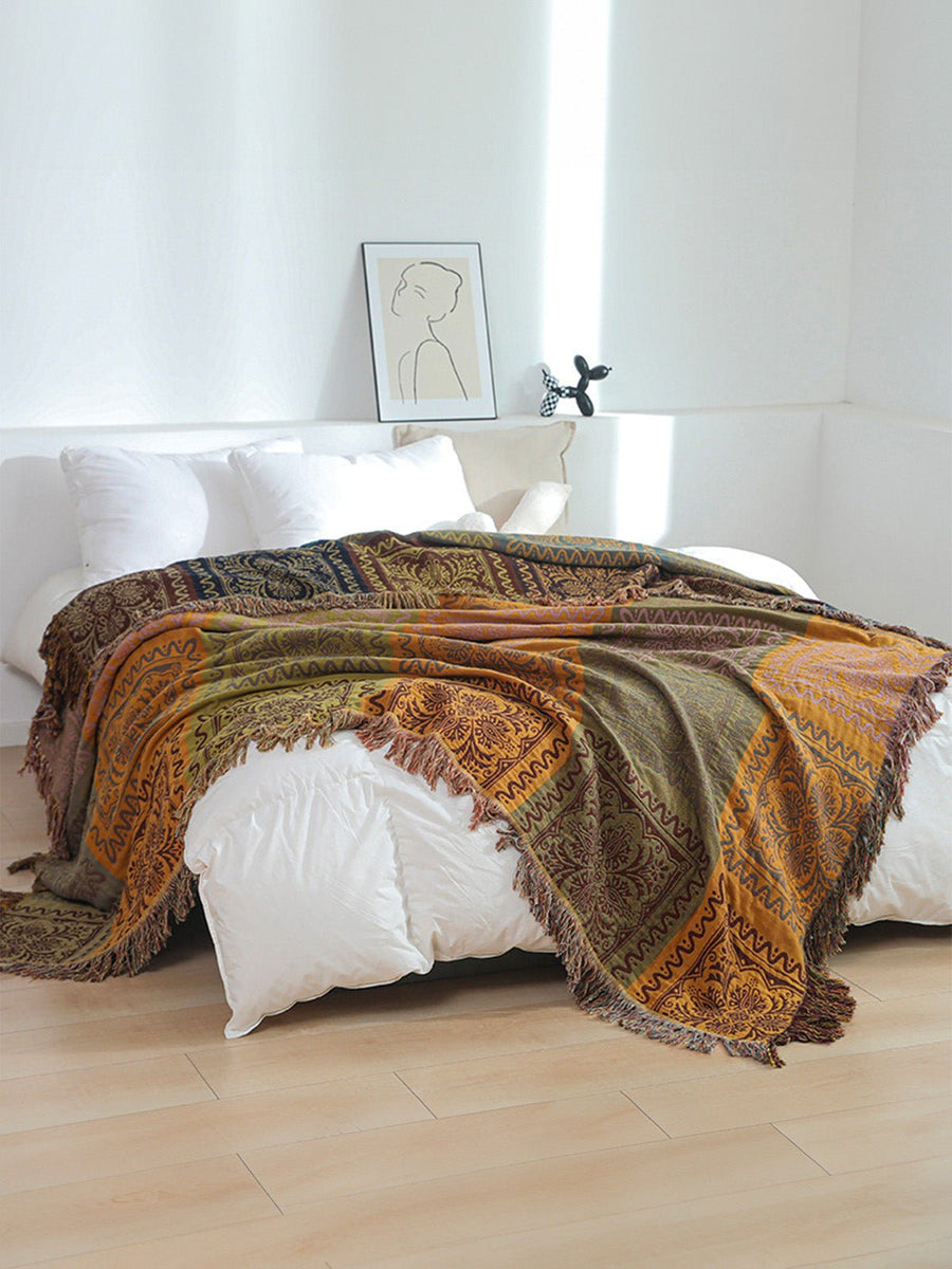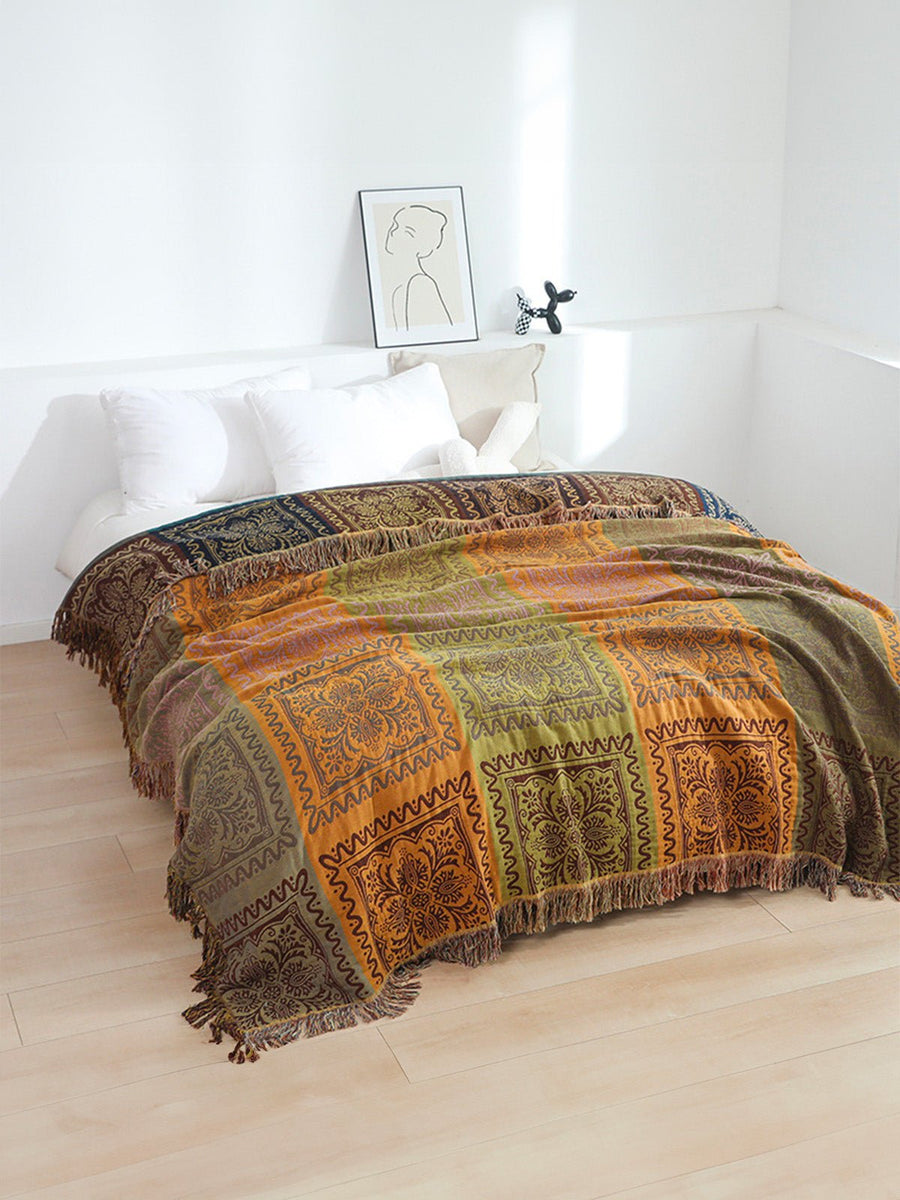 Plaid boho in cotone, copriletto morbido, coperta leggera, motivi etnici, frange decorative, modello Niva