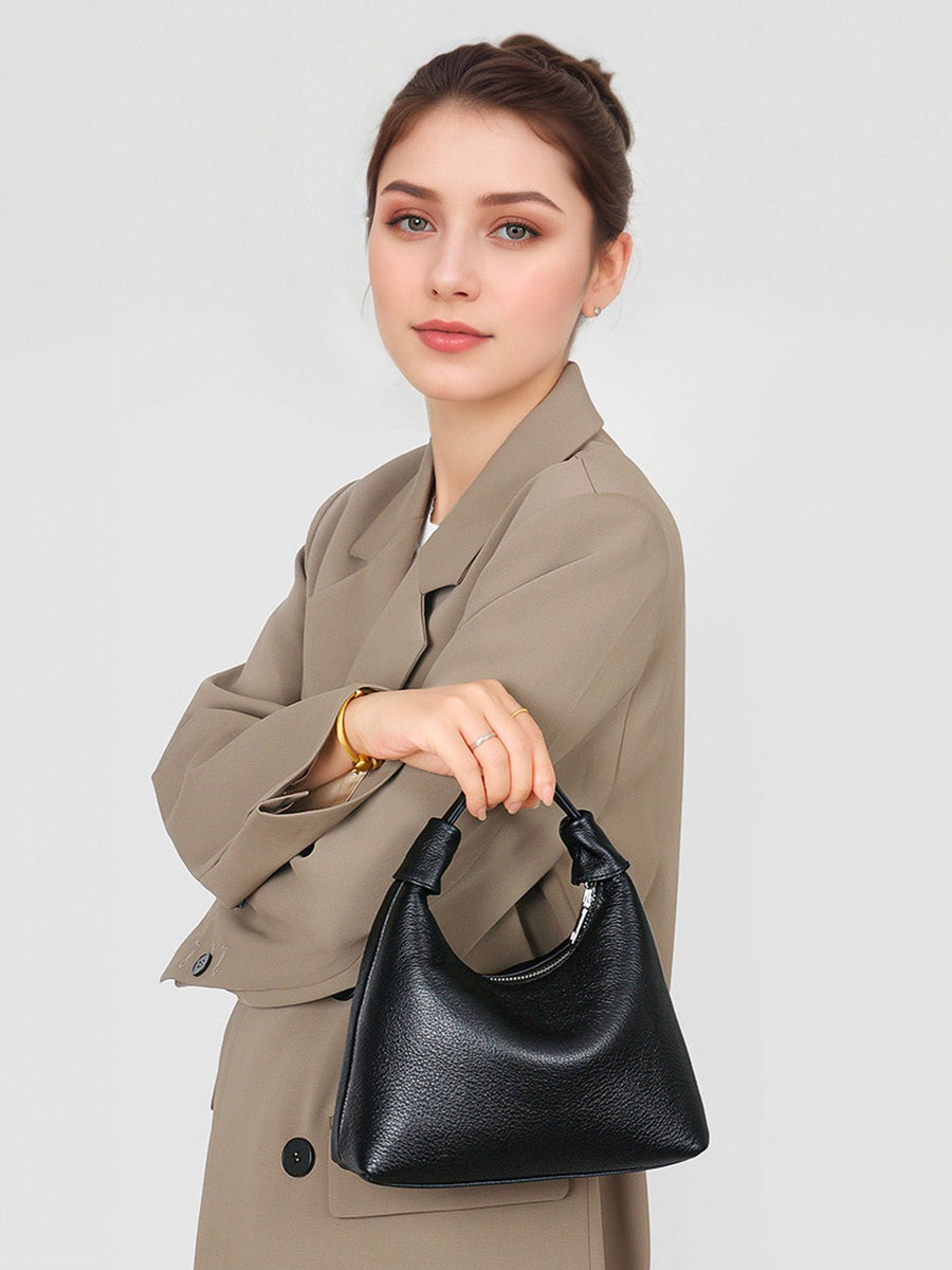 Borsa a mano a forma di conchiglia in pelle martellata, manico annodato, da portare a mano o a tracolla, chiusura con zip di sicurezza, nero o bianco sporco, modello Nymphe