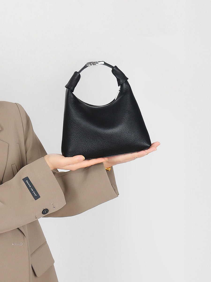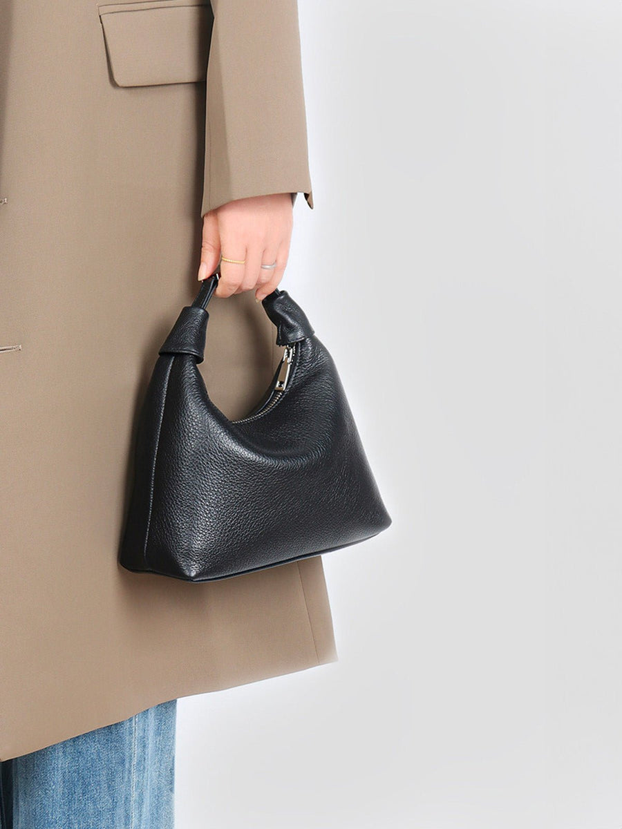 Una mini borsa dal formato compatto pensata per accompagnare la vostra giornata. La sua silhouette a forma di conchiglia valorizza la pelle martellata e un manico corto drappeggiato da nodi, piacevole al tatto. Il volume accoglie facilmente uno smartphone, un piccolo portamonete, delle chiavi e un balsamo labbra.