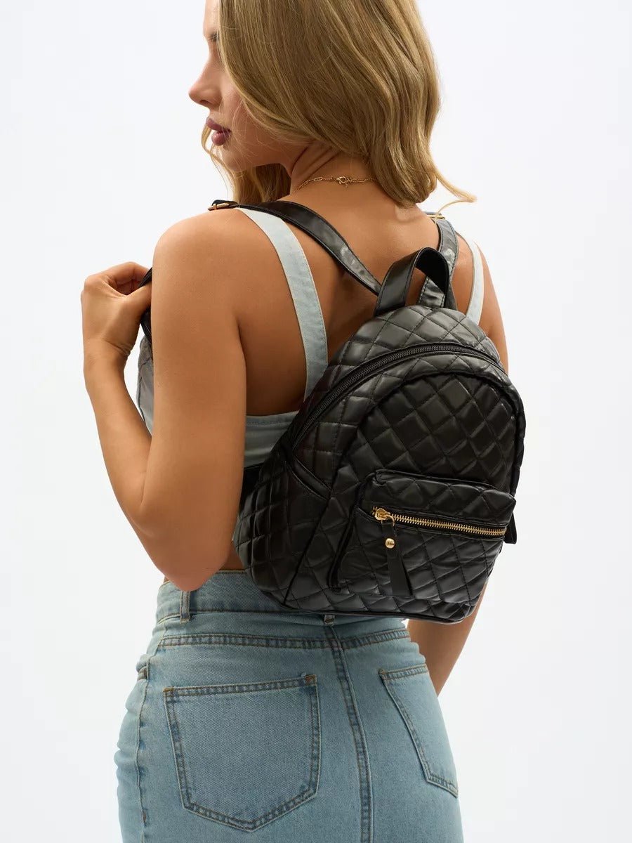Compatto, funzionale e decisamente di tendenza, questo piccolo zaino trapuntato si impone come un accessorio essenziale per accompagnare tutte le vostre giornate attive. Grazie al suo design strutturato a losanghe e alle sue finiture metalliche dorate, unisce fascino contemporaneo e praticità senza compromessi.