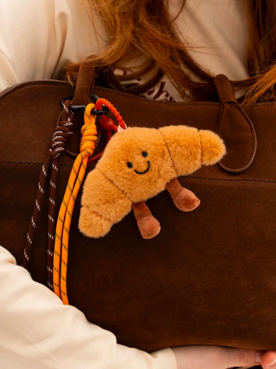 Realizzato in morbido peluche, questo croissant divertente è dotato di piccole gambe penzolanti e di un sorriso ricamato che conquisterà grandi e piccini. Si aggancia facilmente grazie al suo moschettone pratico e all’attacco a spirale colorata.