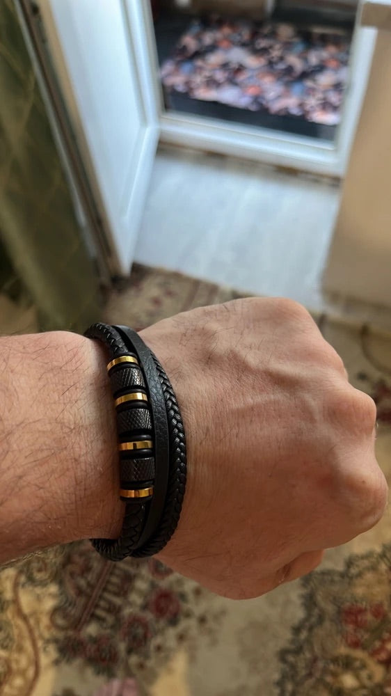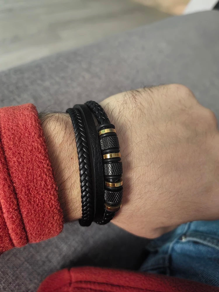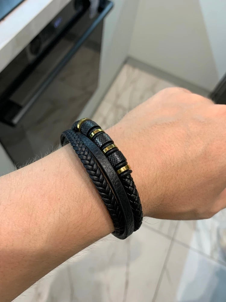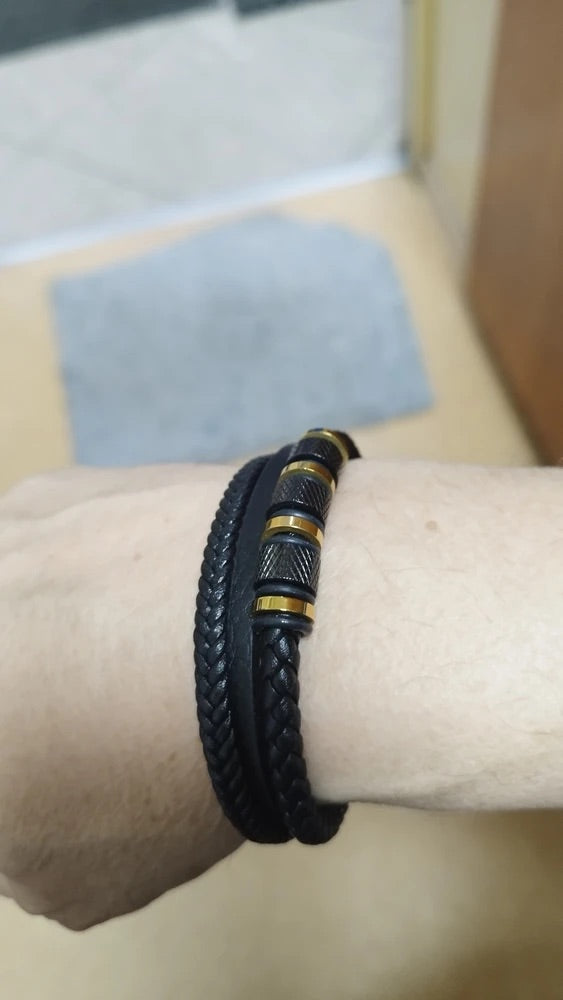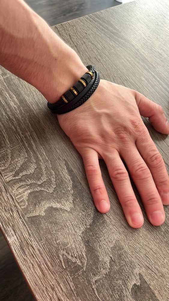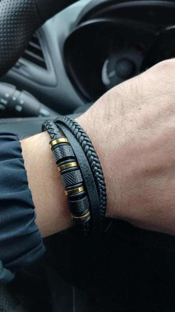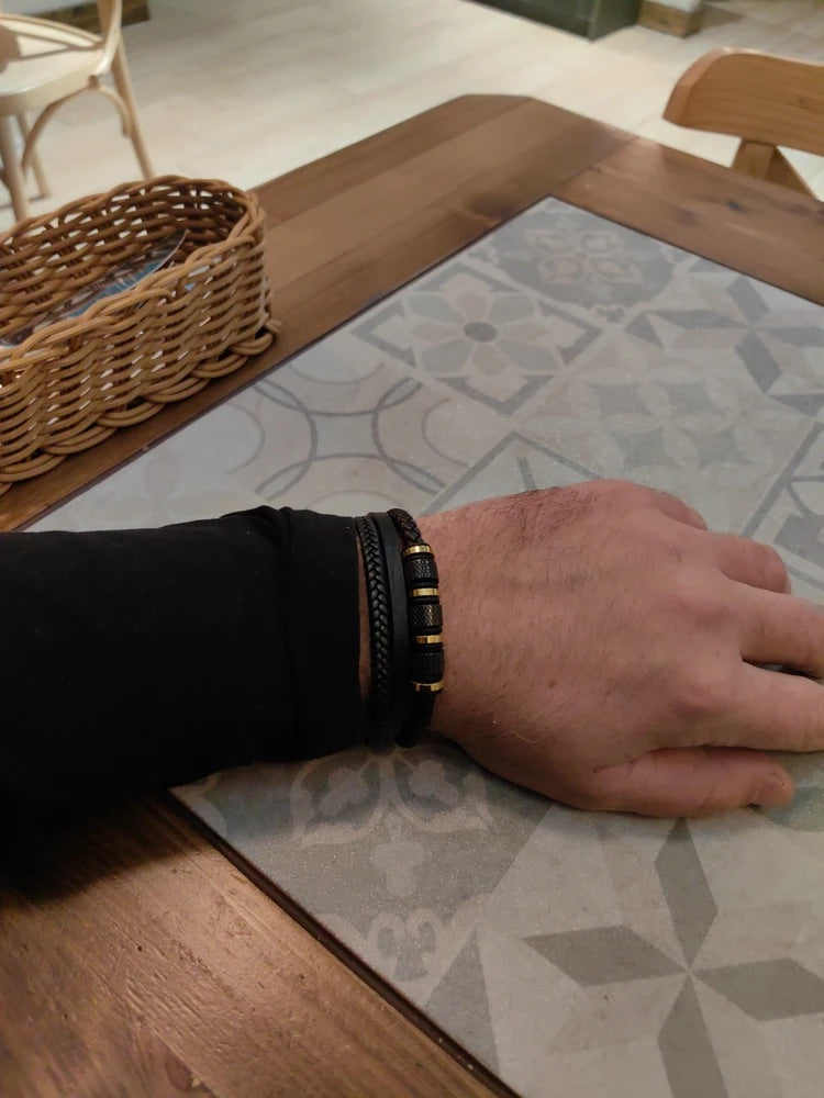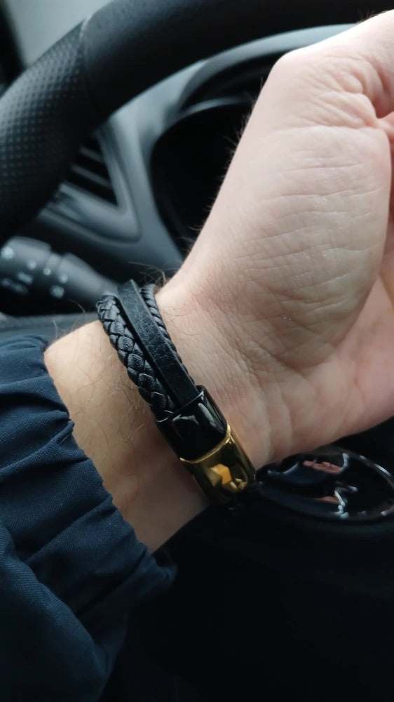 Bracciale da uomo in pelle intrecciata nera, titanio, chiusura magnetica, con dettagli dorati, modello Oscar
