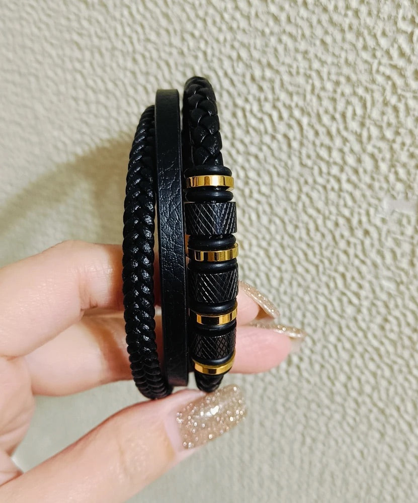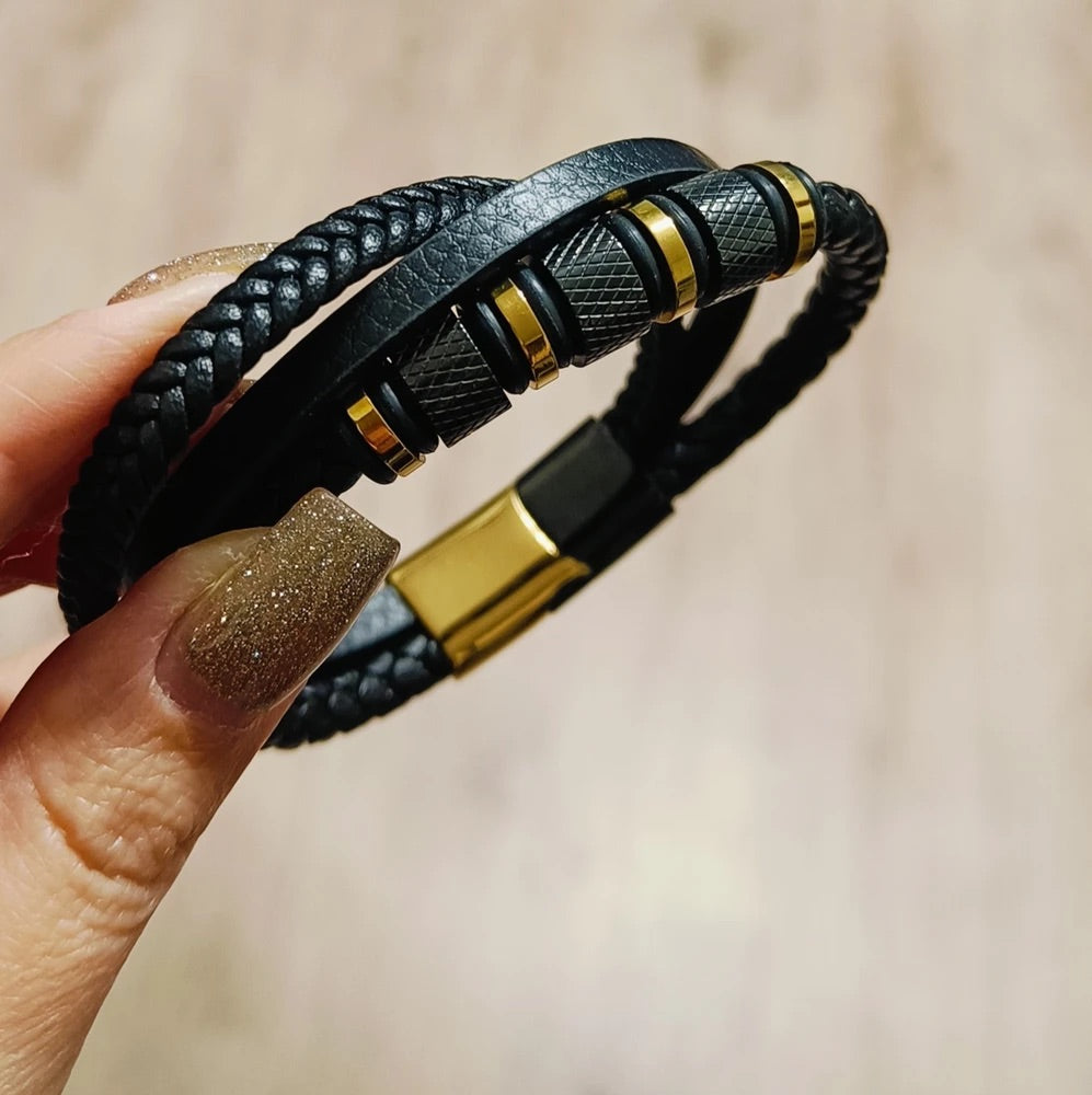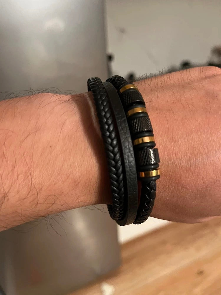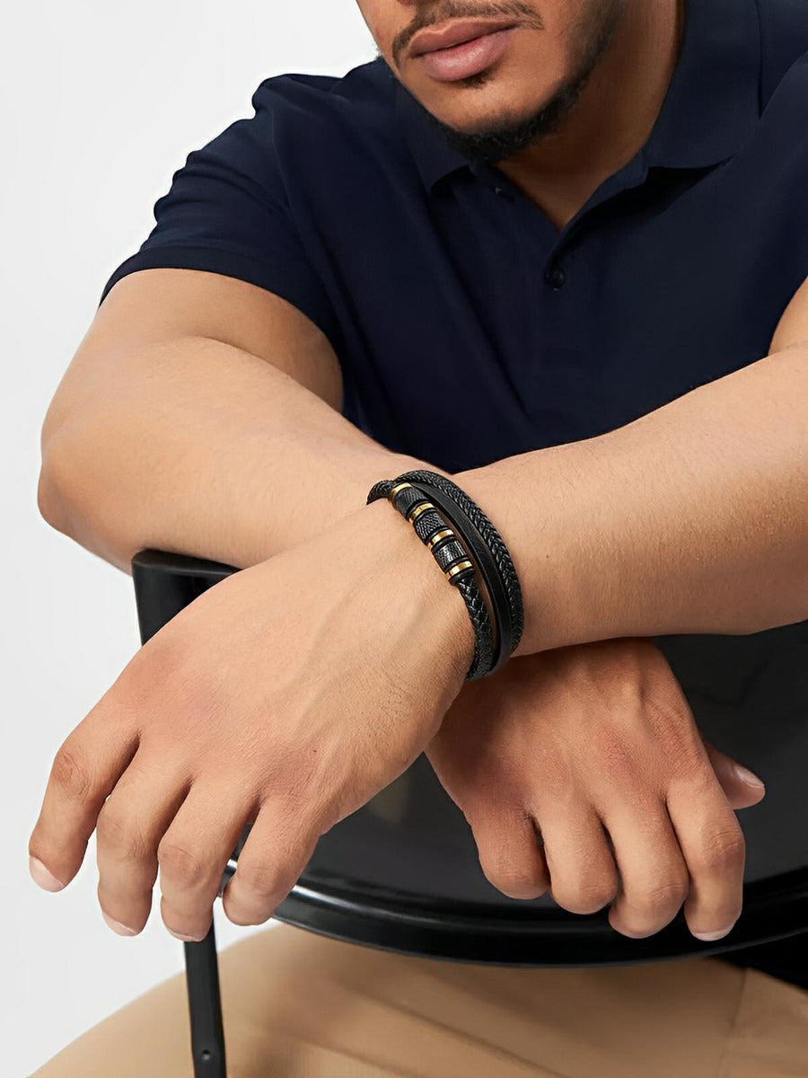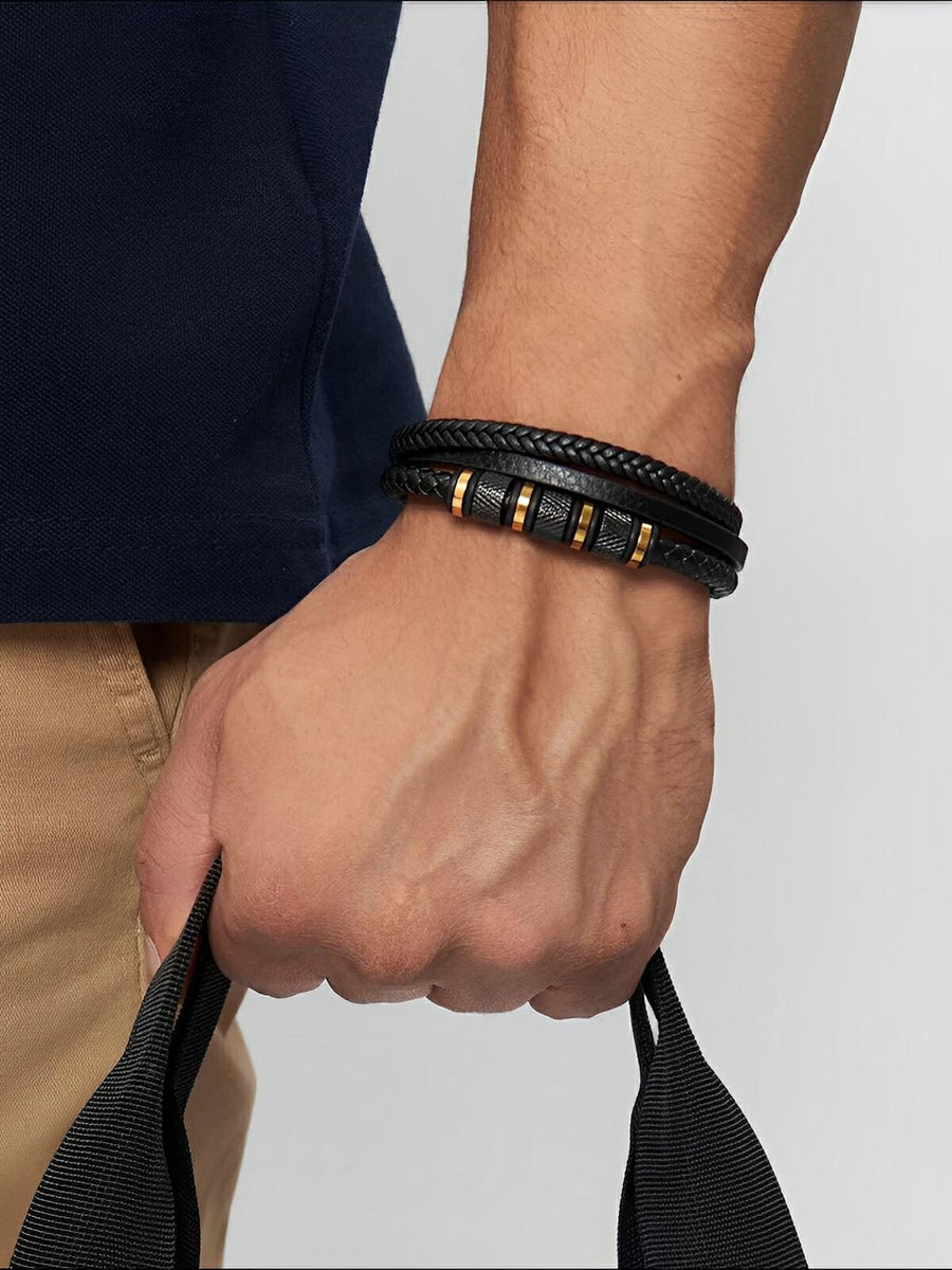 Bracciale da uomo in pelle intrecciata nera, titanio, chiusura magnetica, con dettagli dorati, modello Oscar